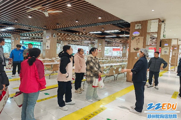 大会结束后,在学校副校长周斌的带领下,家长代表们深入校园餐厅,实地参观了食材储存区、烹饪操作间、餐具消毒间等关键区域。参观过程中,餐厅负责人详细介绍了食材采购的正规渠道、严格的索证索票制度、每日食品留样规范,以及餐具“一刮、二洗、三冲、四消毒、五保洁”的标准化流程。家长们认真查看了公告墙上的带量食谱和菜品定价表,细致检查了食堂整体环境卫生状况,并不时就食品加工的安全细节向负责人提问。面对分区明确、流程规范、卫生达标的餐厅管理现状,家长们纷纷给予高度肯定。