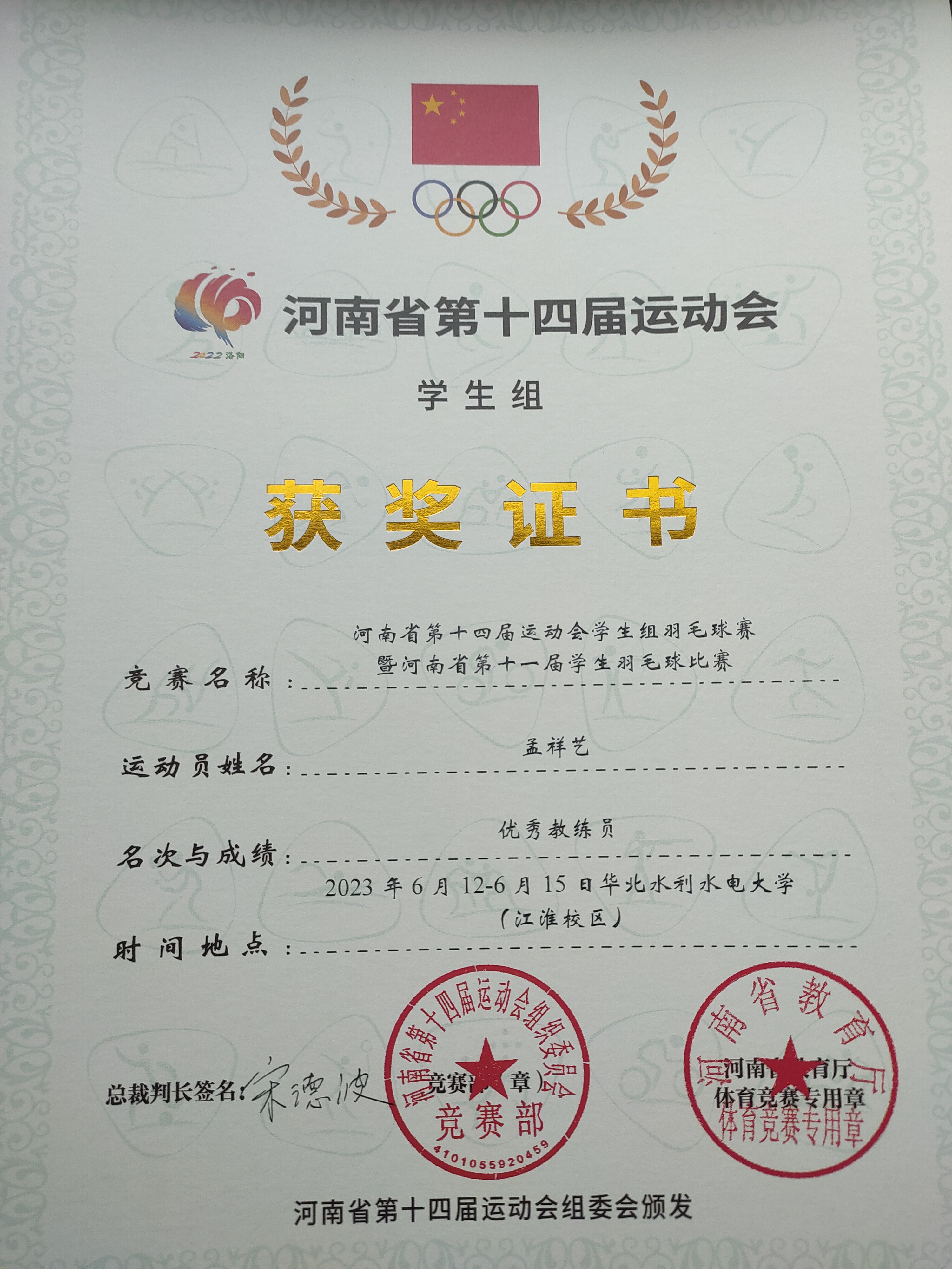 郑州八中羽毛球项目的开展已有多年历史,曾多次获“郑州市中小学生体育节羽毛球比赛”一等奖。2018年,学校成立郑州八中羽毛球运动队,教练员为体育教师孟祥艺,所带学校运动员近年来在省市羽毛球比赛中获有骄人成绩。2023年河南省第十四届运动会学生组羽毛球比赛上,孟祥艺带领郑州市代表队,获得初中组男子团体冠军,单项赛获得两冠四亚,为郑州市争得了荣誉,孟祥艺被评为省运会优秀教练员。