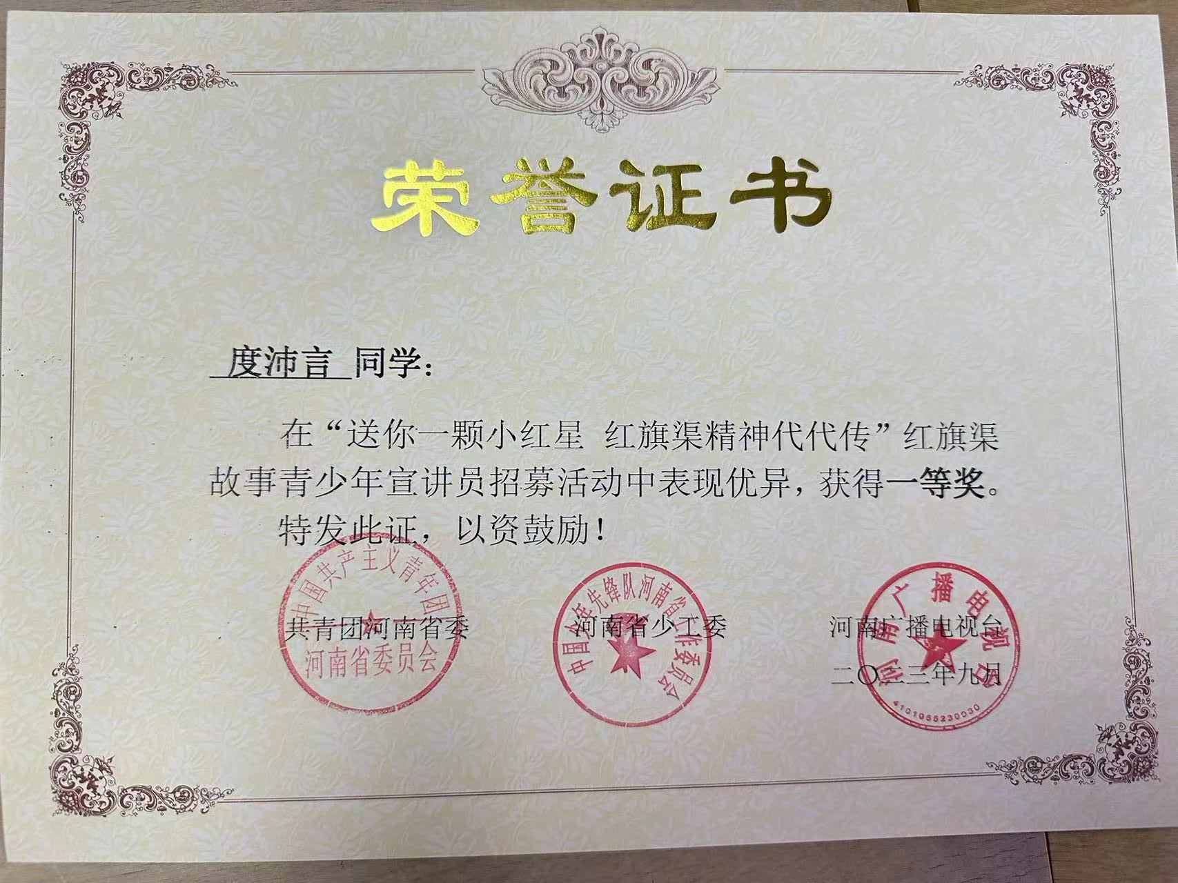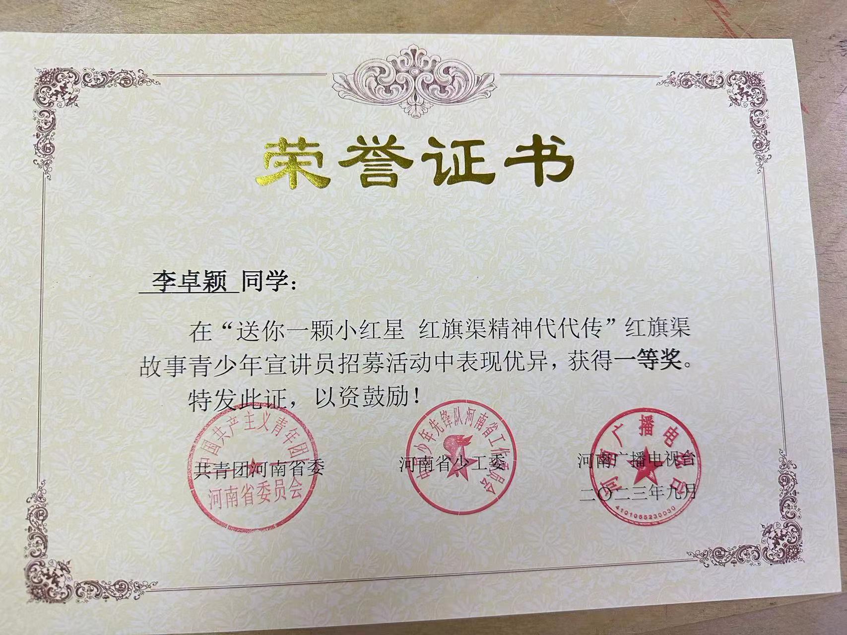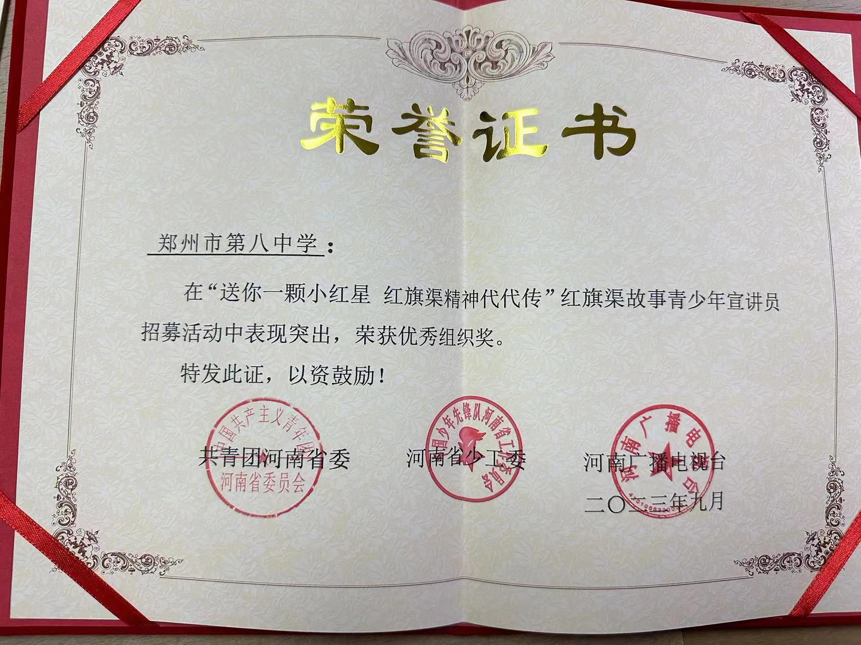 近日,郑州八中团组织学生参加由中共河南省委宣传部、共青团河南省委、河南省少工委、河南广播电视台联合主办的“送你一颗小红星 红旗渠精神代代传”宣讲活动。在这次宣讲活动中,郑州八中度沛言、张诗祺、刘相文博、李卓颖四名同学获得一等奖,马牧溪和李宝诺同学获得二等奖。郑州市第八中学获得优秀组织奖。