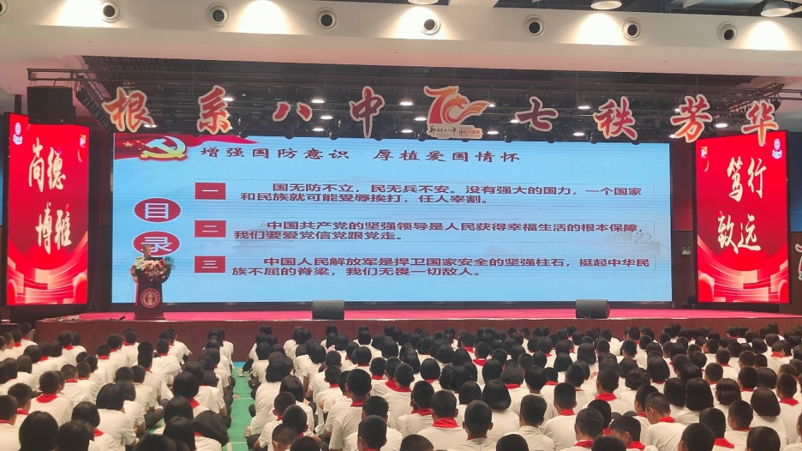 一直以来,郑州八中以爱国主义教育为主旋律,以“强健意志体魄,增强国防意识、普及国防知识”为总体目标,大力弘扬爱国主义教育,积极探索国防教育有效途径,通过集会、国旗下的演讲、革命纪念日主题教育活动、团队日活动等形式多样、内容丰富、特色鲜明的国防教育活动,厚植家国情怀。