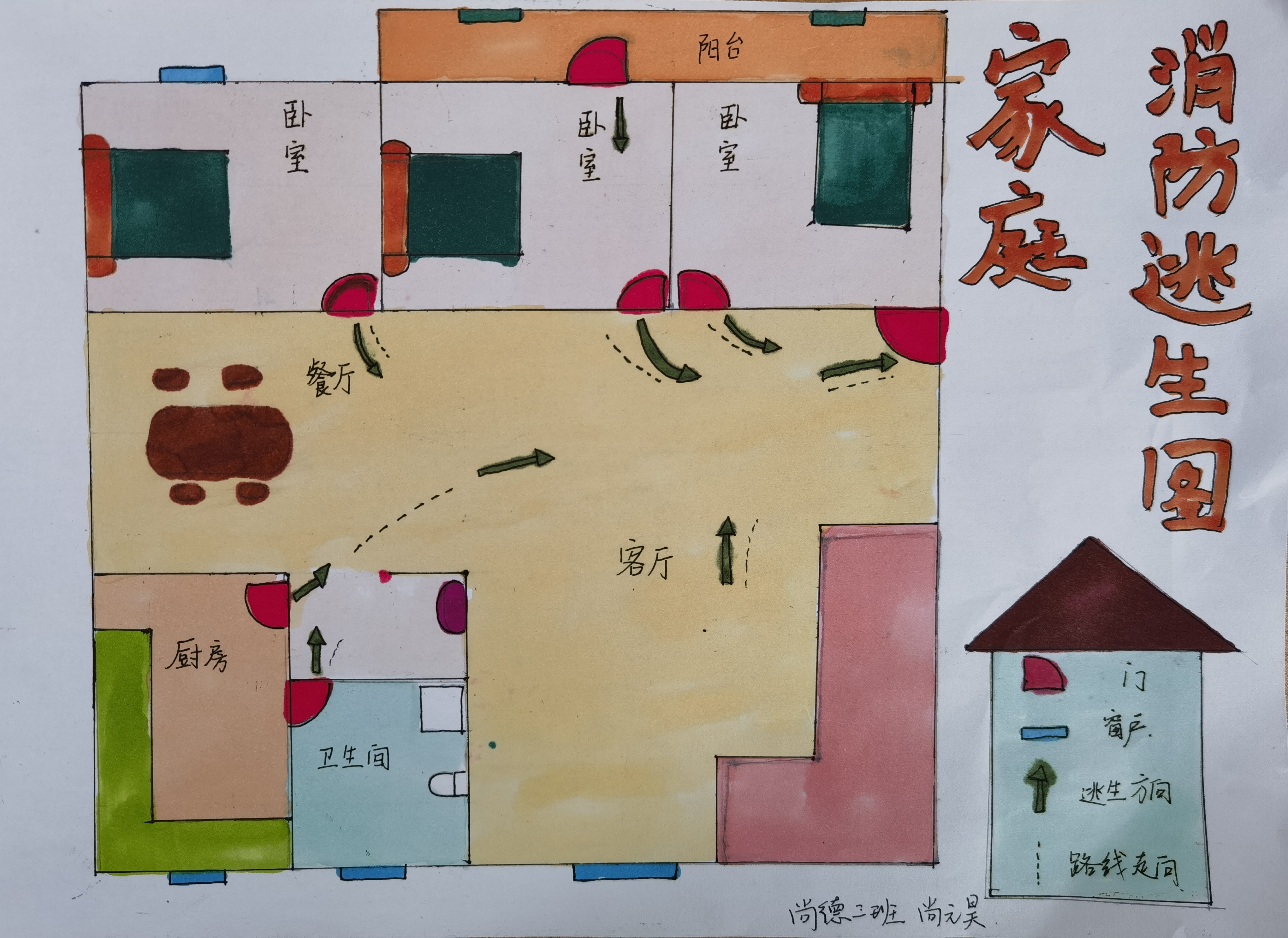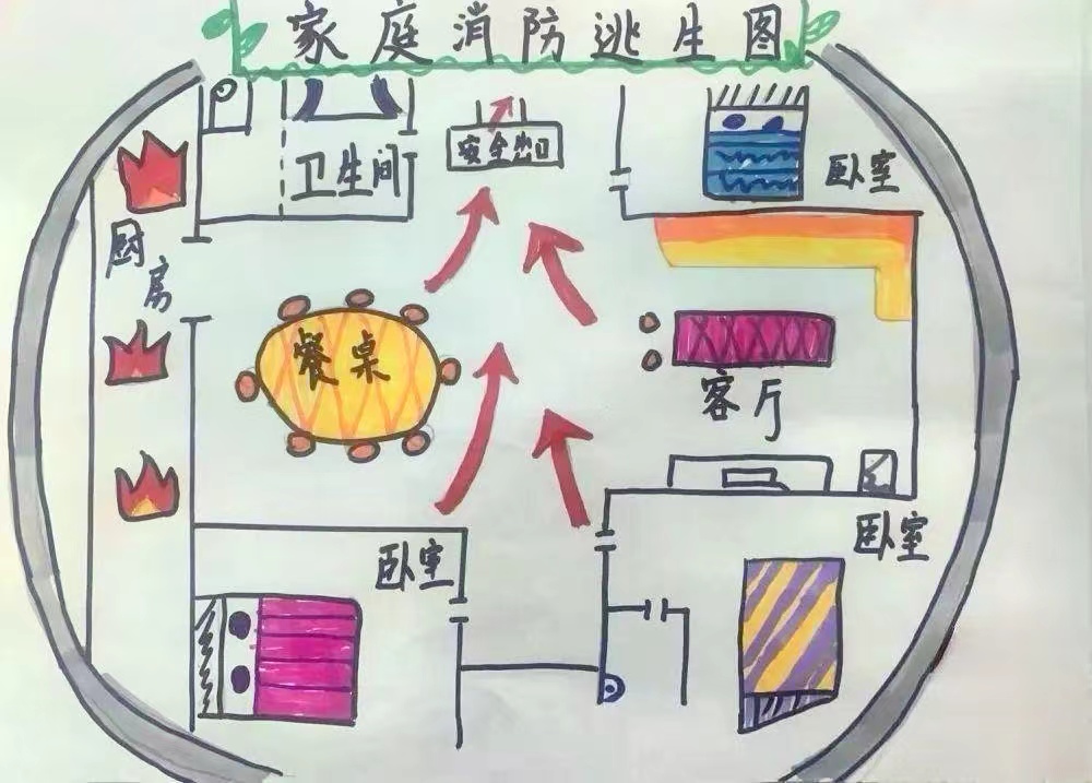 为增强学生的消防安全意识和自防自救能力,筑牢坚实的安全防线,共同打造安全幸福的美好家园,学校德育处布置了一项特殊的家庭作业:绘制家庭逃生路线图。