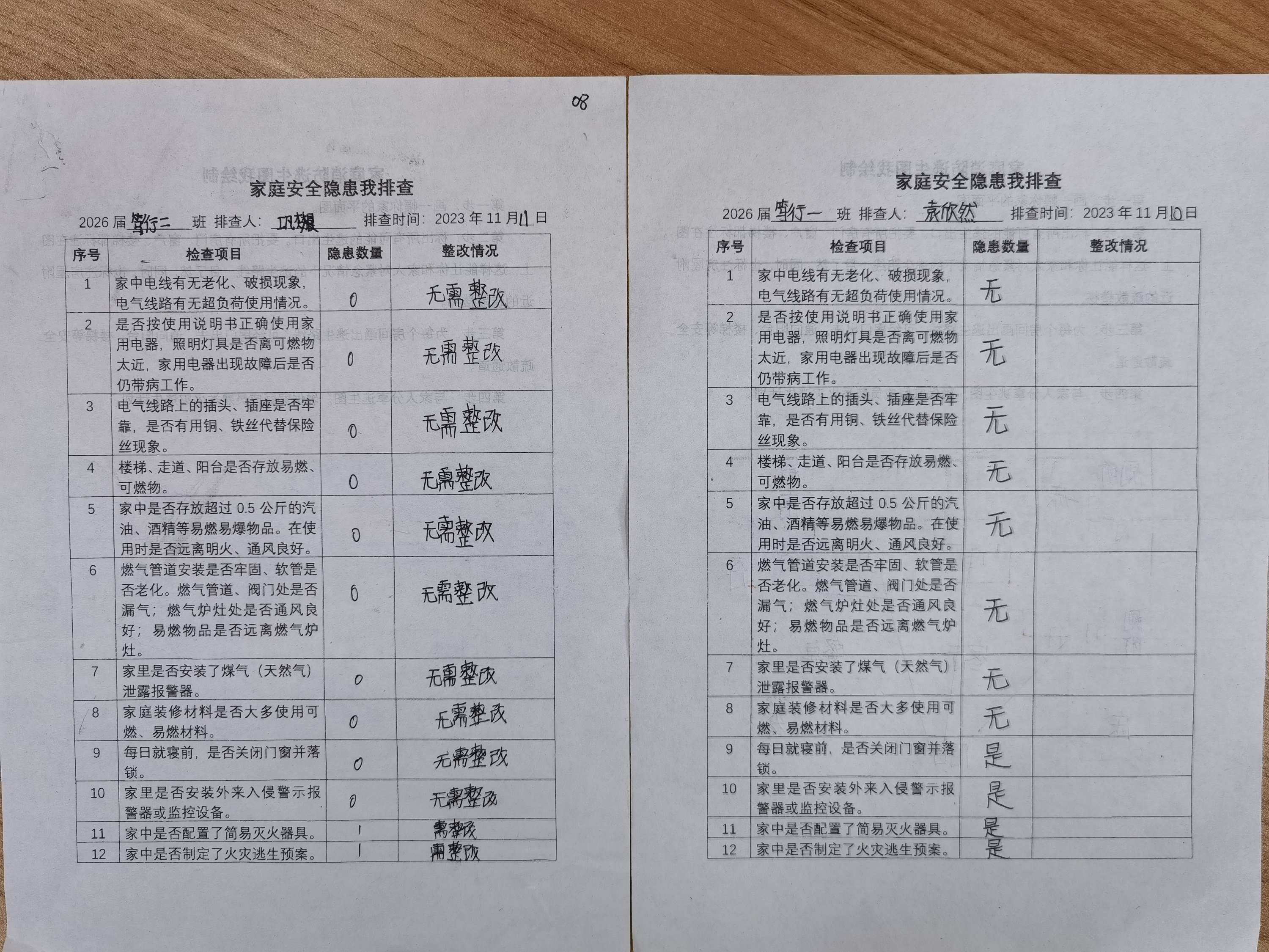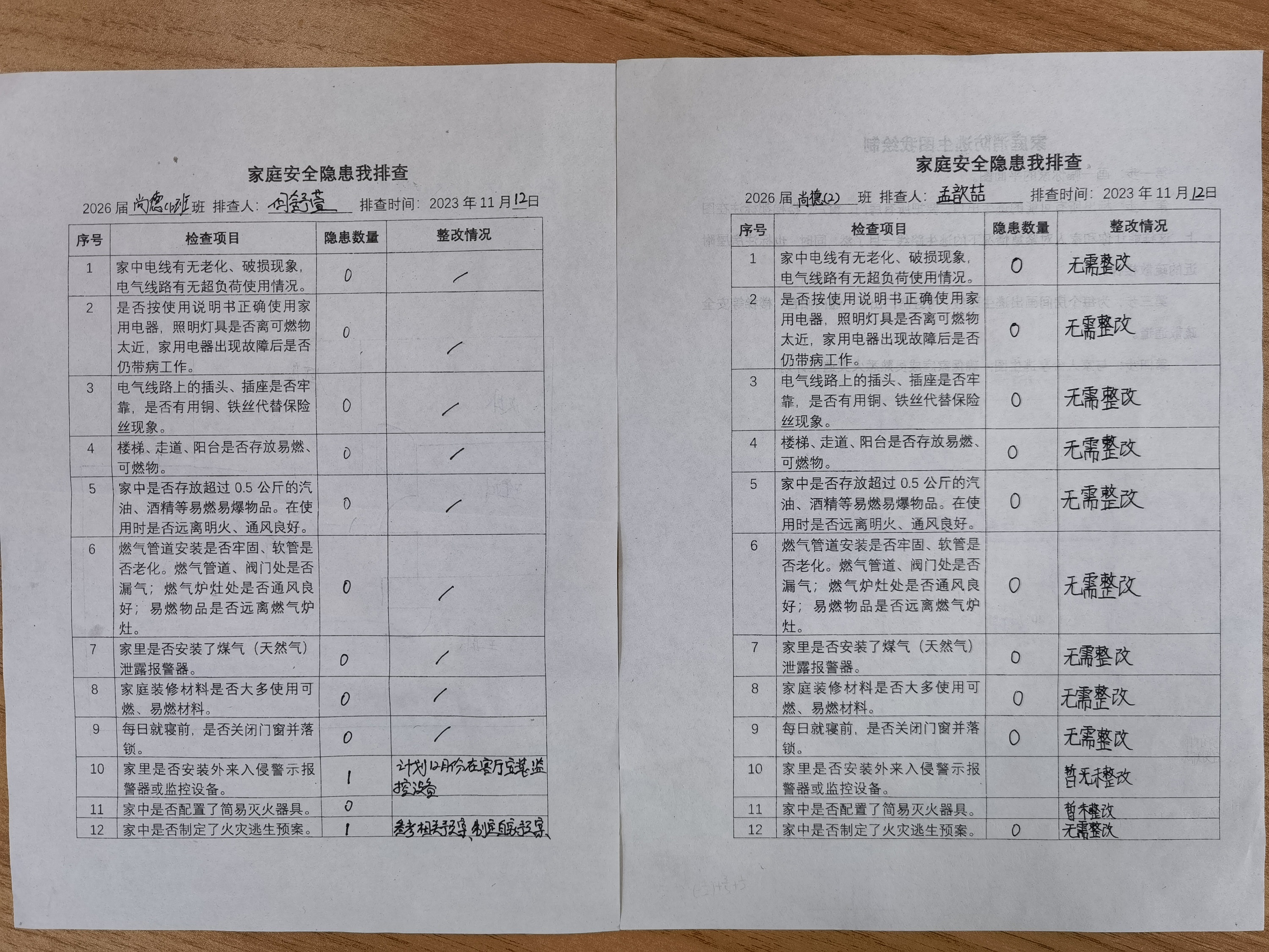 家庭是社会的一个细胞,安全是家庭幸福的基础保障。周末,班主任老师发放了家庭安全隐患排查表,要求学生按照项目逐一排查:家中电线有无老化、破损现象,电气线路有无超负荷使用情况;是否按使用说明书正确使用家用电器,照明灯具是否离可燃物太近,家用电器出现故障后是否仍带病工作;楼梯、走道、阳台是否存放易燃、可燃物;燃气管道安装是否牢固、软管是否老化,燃气管道、阀门处是否漏气等内容,并督促家人一同排除隐患,防患于未然,构筑家庭安全屏障。
