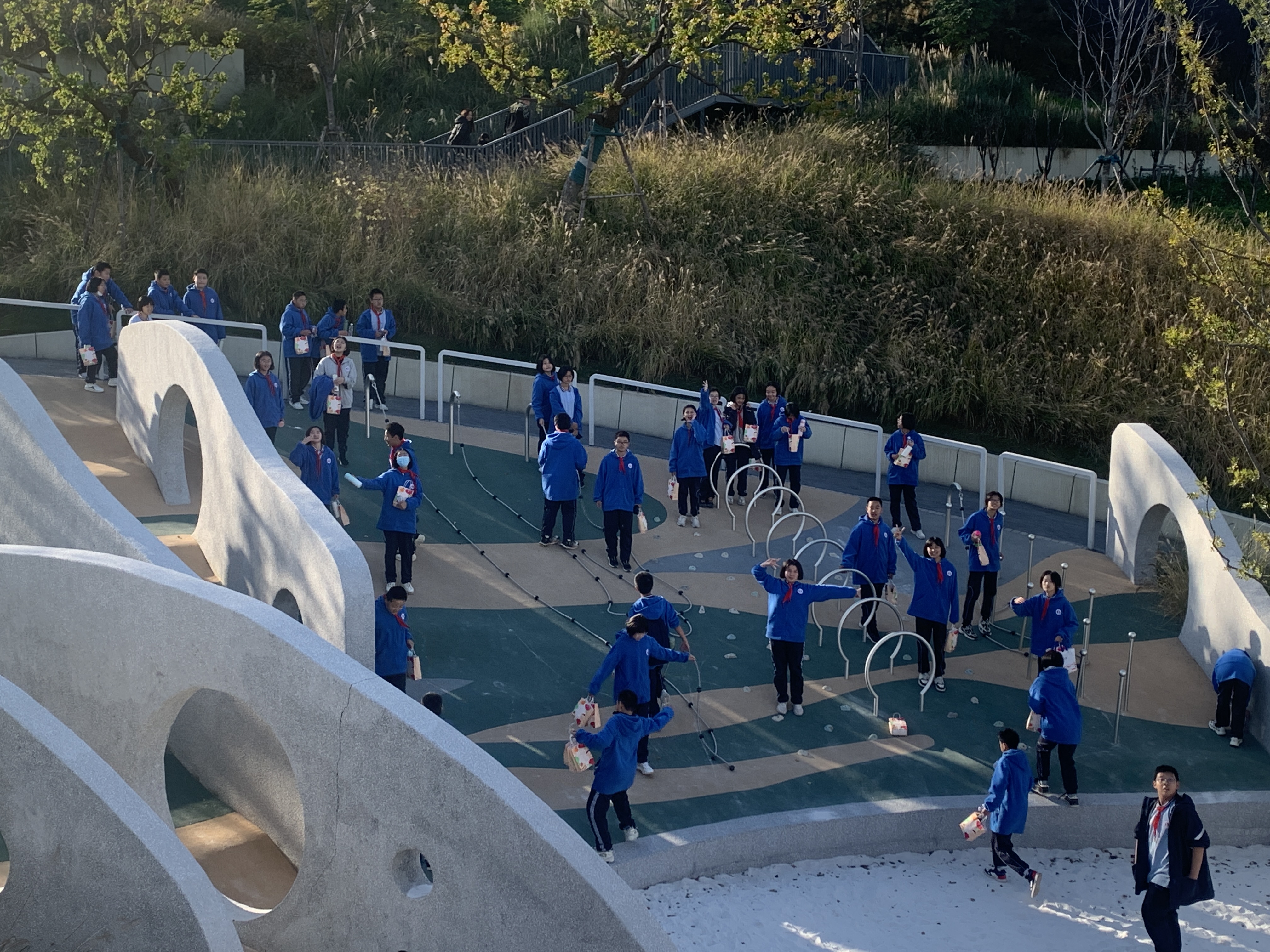 安全重于泰山,学校领导带领工作人员、各班班主任及随队老师指挥引领学生有序、快速通过路口。到达目的地后,全体师生开启拥抱大自然模式,或选择爬山,感受“海到尽头天作岸,山登绝顶我为峰”;或选择玩蹦蹦床、滑滑梯、攀爬,享受一份童真的乐趣;或选择拾级而上,享受徒步健身的快乐。大家积极参与,乐在其中。