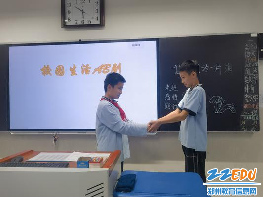 在老师的引导下,同学们走进“校园生活AB剧”,围绕着生活中的具体情境进行合作探究:当你觉得身边的某个同学看起来“呆呆”的时候;当同学对你出言不逊的时候;当同学提出不同的活动方案,在你看来并不十分优秀的时候;当你觉得老师误解了你,对你处理不公的时候……在思维碰撞中掌握了宽容小窍门:一个点头、一抹微笑、一句道歉、握手言和,便能消融彼此心中的坚冰。