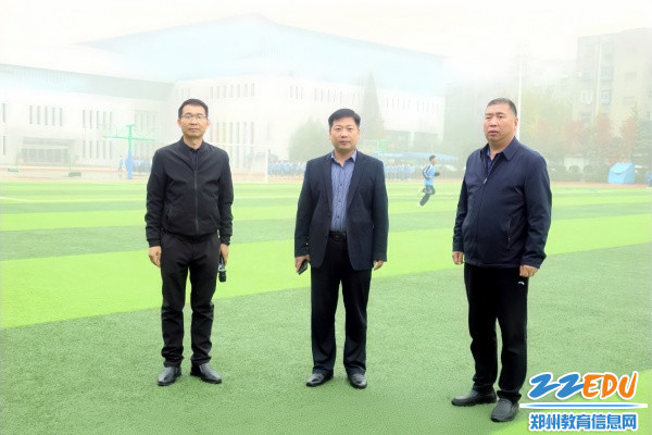 郑州市第十九高级中学校长张浩(中)、副校长李伏庆(右)现场指挥疏散演练。