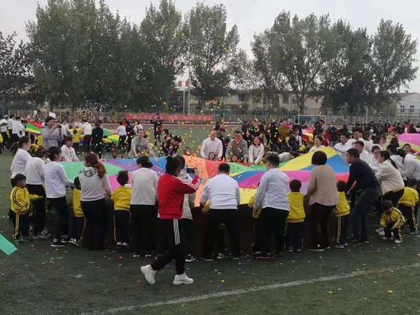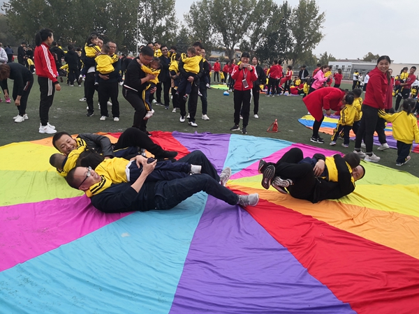 此次运动会以“彩虹伞”为器材开展各种游戏。幼儿园特意邀请郑州思扬教育机构的男教师团队们来组织运动会的游戏环节。游戏“泡泡糖”的热身运动让家长和孩子进入良好的运动状态,彩虹伞的玩法多、花样多,在爸爸妈妈的帮助下,一会捉迷藏,一会钻山洞,一会抖起小海浪,一会举起转圈圈,一会变成小被子,一会变成蒙古包……在游戏的海洋里,孩子们的欢乐别样多。运动场上的孩子们,将体育精神展现得淋漓尽致,他们与爸爸妈妈们奋力拼搏,力争上游。他们在体验中感受到了爸爸妈妈的爱,在运动中感受到了锻炼带来的快乐!爸爸妈妈,孩子们的童年只有一次,多么希望你们以后每天能抽一点点时间陪陪他们,因为有你们的呵护,宝贝们才能真正快乐啊!