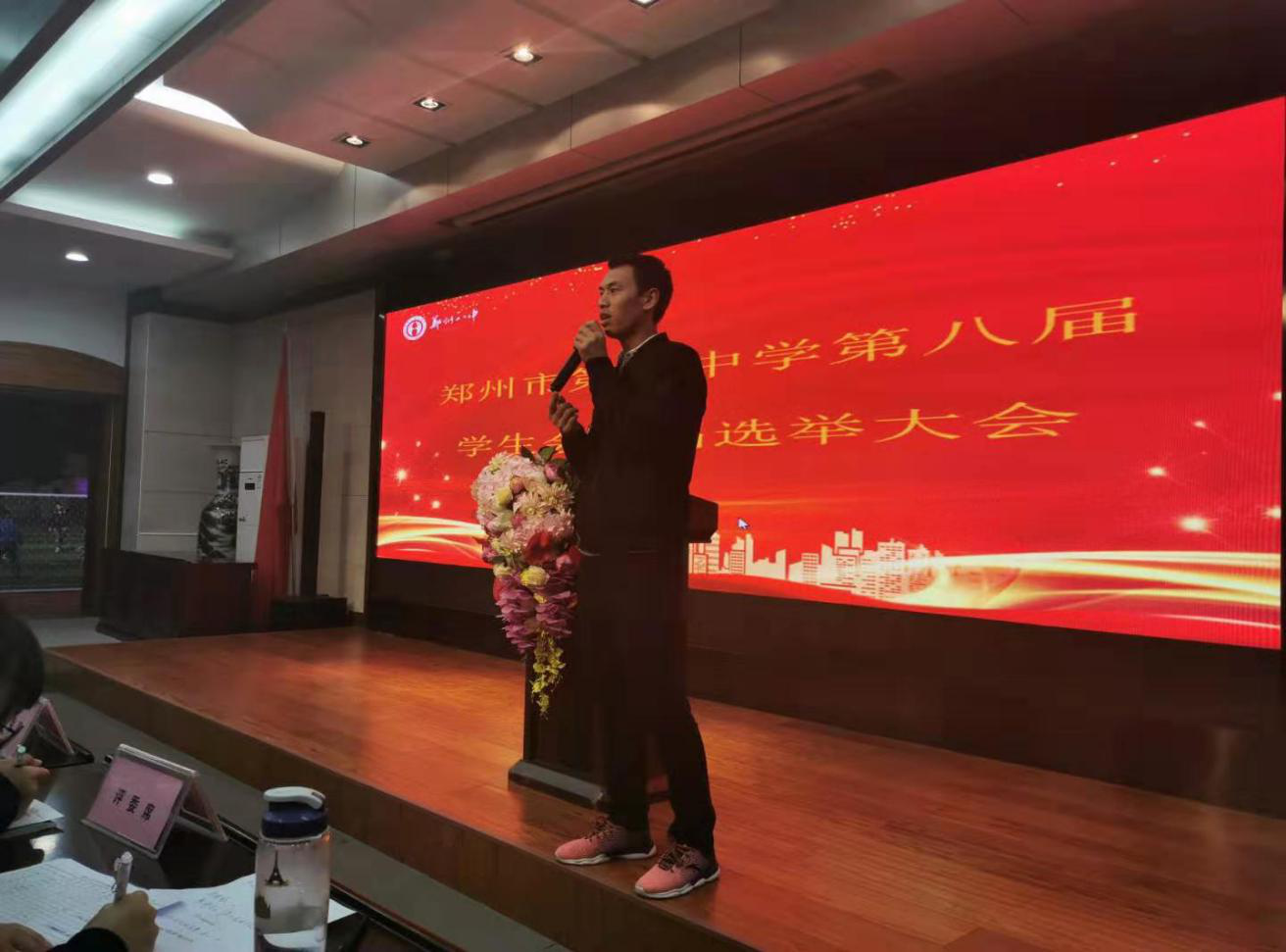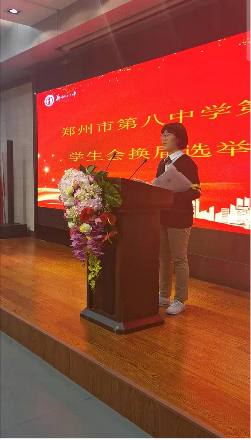 本次选举活动中由郑州八中政教处副主任甘铁权担任评委组组长,团委书记黄晓杰担任副组长,政教处张燕老师、孙淑英老师、现任学生会主席团及各部部长担任评委组成员,七八九年级各班学生干部作为学生代表参加此次大会。