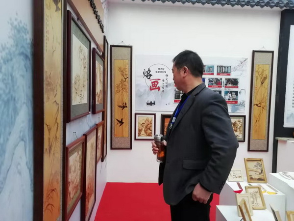 开幕式后,与会多位领导来到师家河小学烙画成果展区,一边认真聆听有关烙画非遗特色的介绍,一边观赏孩子们和老师们的烙画作品,对这些参展作品之精美之精细而啧啧赞叹。