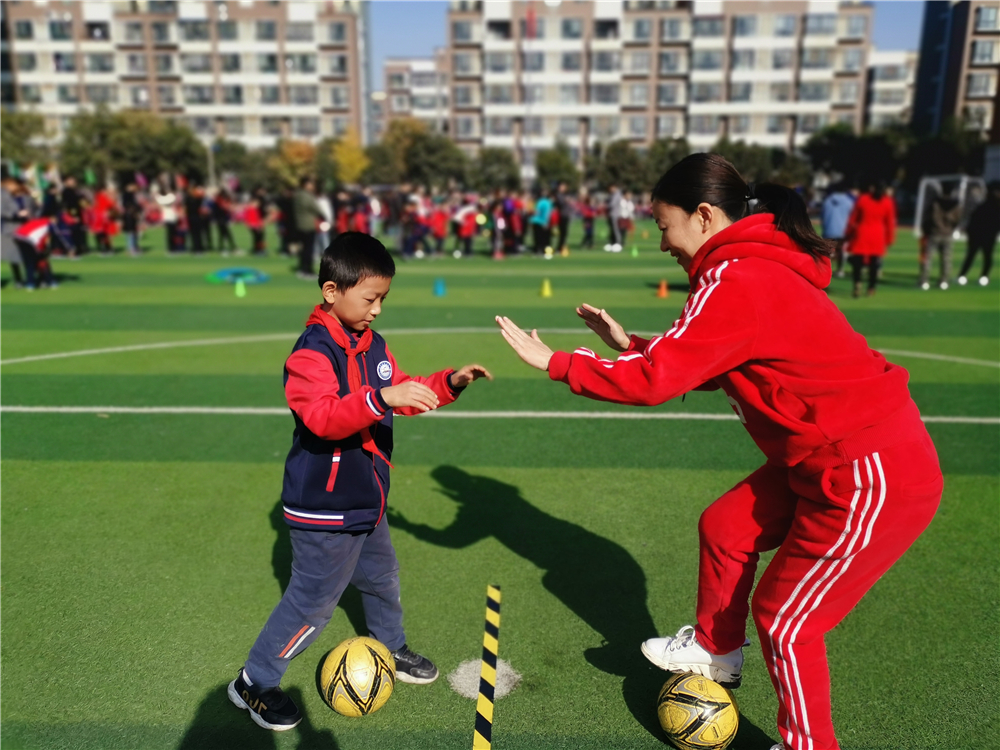 活动开始了,整个操场顿时沸腾了起来,欢呼声、加油声、喝彩声此起彼伏,响成一片。本次足球嘉年华活动根据各年级学生的特点制定了不同的比赛项目:团体比赛一、二年级开心毛毛虫和小袋鼠,三、四年级爱心传递和足球保龄球,五、六年级完美搭档和九宫格射门。同学们专注的眼神,抿在一起的嘴巴,紧紧握着的小手,无一不说明了他们的认真和努力。团体的比赛不仅让同学们体会到足球的乐趣,也锻炼了同学们的团队合作意识。个人赛也在如火如荼的进行,行进间双脚交替踩球、穿越火线、颠球,每个参赛队员都牟足了劲,向着第一的目标发起冲锋。亲子运动项目更是高潮迭起,家长和孩子们同心协力,既体会到游戏的乐趣又增强了亲子之间的关系。整个赛场气氛热烈又紧张,扣人心弦又不失活泼,每个参赛队员都竭尽全力,比赛掀起一个又一个高潮。