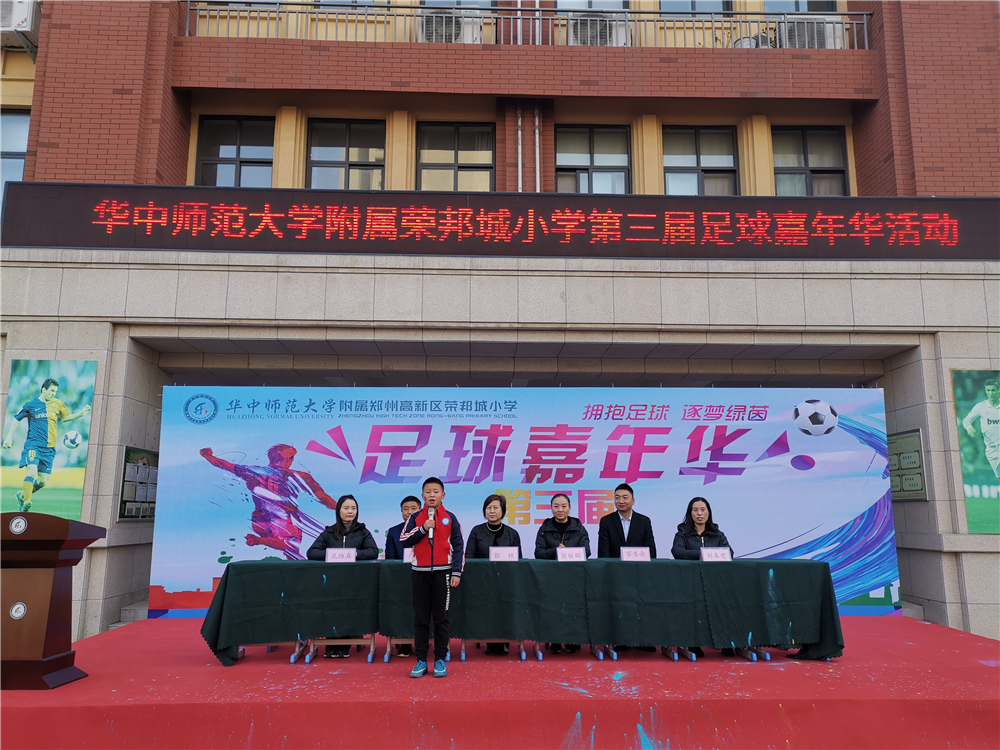 升旗仪式后,卢洪阶副校长致开幕词、运动员代表宣誓、裁判员代表宣誓。最后,张艳校长宣布华中师范大学附属郑州高新区荣邦城小学第三届足球嘉年华活动正式开始。