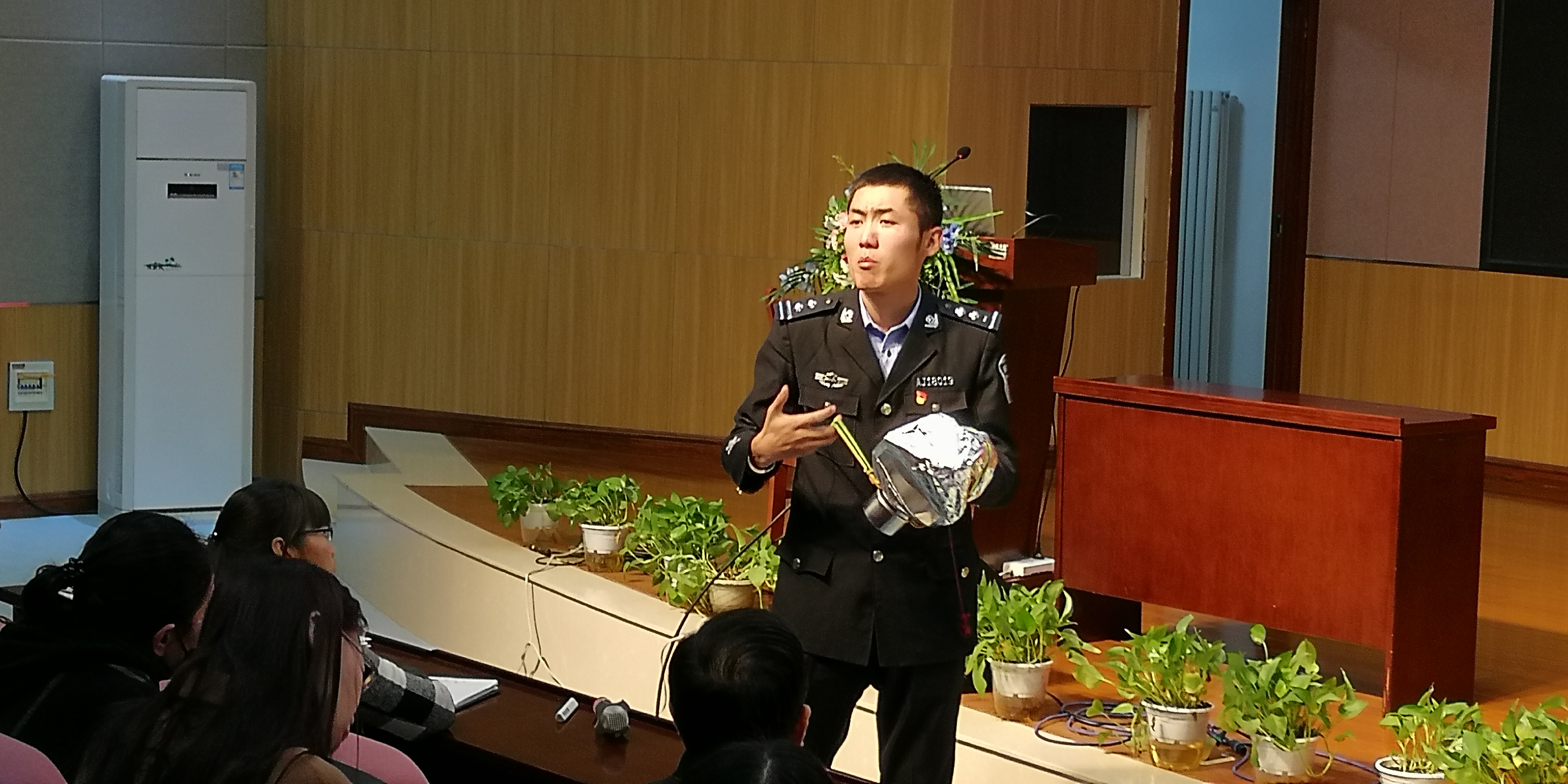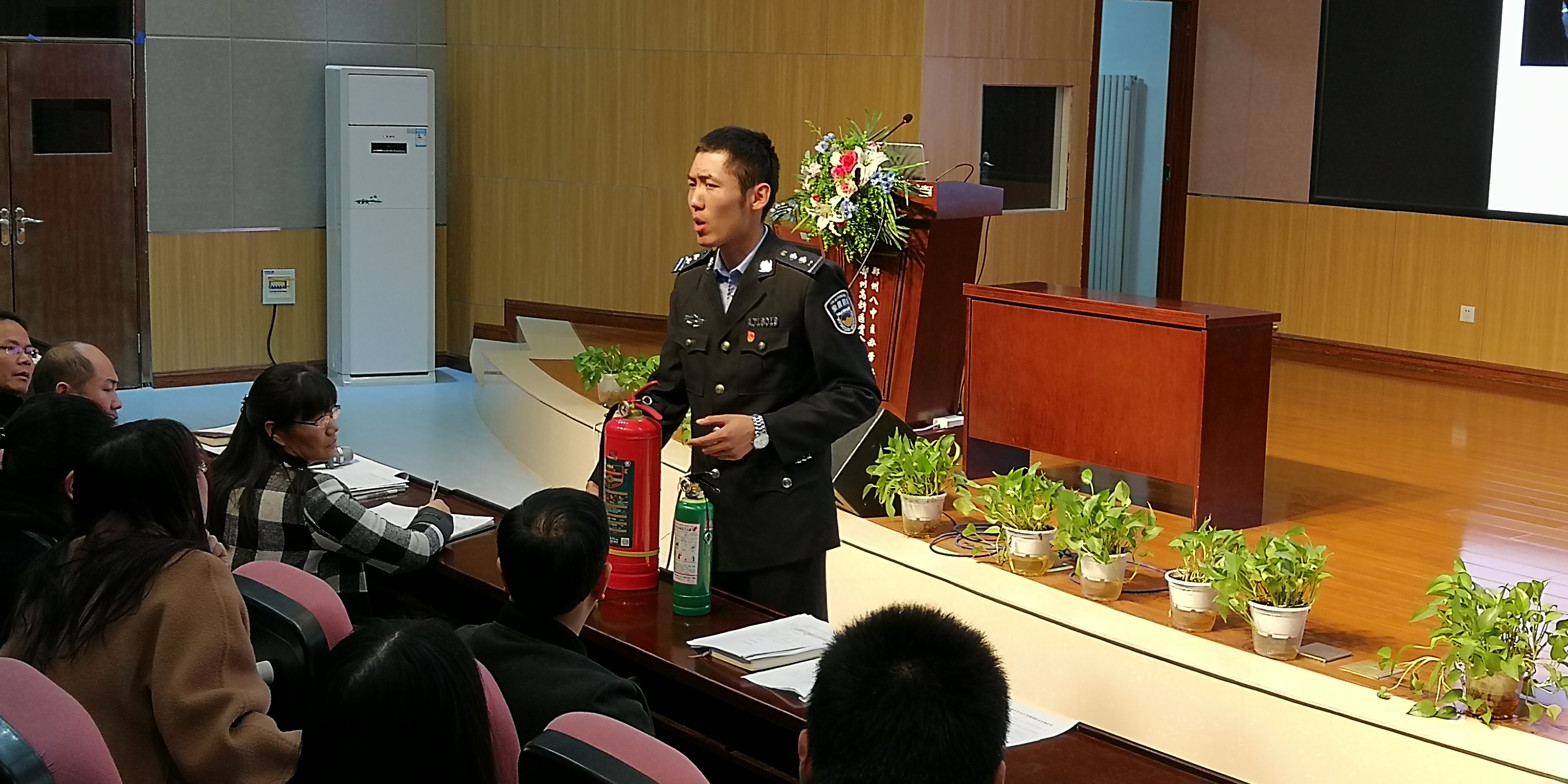 李俊良教员重点讲解了三级消防责任制,旨在增强大家的安全责任意识,并结合亲身参与的实际案例,配以一幅幅触目惊心的图片、一段段发人深省的视频,生动地为老师们普及了消防安全知识,听众席不时传来惊异、惋惜之声,甚至有老师拿出手机拍照,表现出对培训会的高度重视。在培训的最后阶段,李俊良教员介绍了常规消防设施的使用,并现场演示了报警器、灭火器的正确使用方法,让大家对消防知识有了更直观的了解。