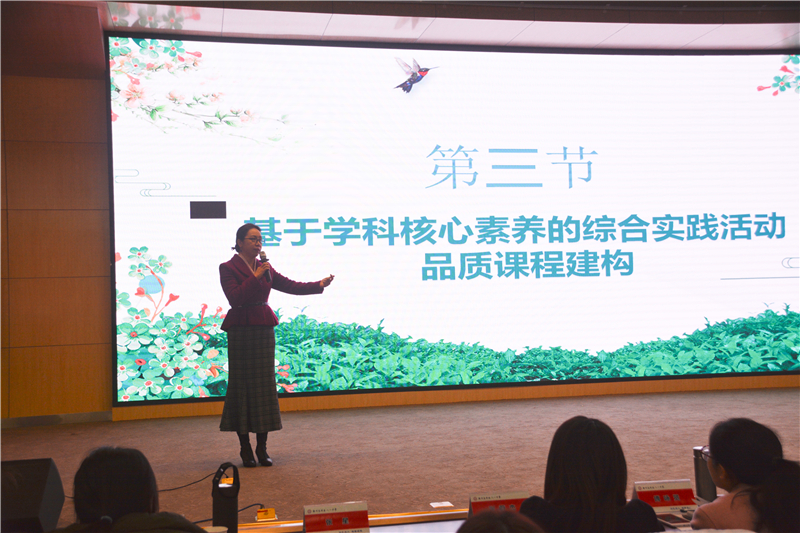随后,曹淑玲老师以《基于学科核心素养的综合实践活动课程开发与实施》为题,从综合实践活动课程的内涵、品质课程的首要原理、建设高品质的综合实践活动课程的路径三方面进行了精彩的阐释。首先,通过《伴你高飞》这部电影,她讲解了综合实践活动课程的内涵——能力培养课程,重点分析了课程总目标、课程的性质、活动(学习)方式,帮助大家厘清了综合实践活动与其它学科课程、校本课程、学科实践活动课程的区别和联系。接着,她总结了现下各校综合实践活动所处的1.0、2.0、3.0三种水平的特征,进一步分析了首要课程原理、3.0课程的五个关键特征,并指出一所优质学校应该有自己的课程模式,即具备课程哲学、课程功能、课程结构、课程实施、课程管理和评价五个方面。最后,对如何构建综合实践活动品质课程规划的路径和策略,提出了操作的基本程序,并建议学校依据2017年教育部出台的《中小学综合实践活动课程指导纲要》,结合学校实际将综合实践活动课程融入到学校课程框架的大主题,将学校已有资源进行统整开发出小课题,撰写出学校综合实践活动课程纲要,分学段阶梯式发展,打造出学校的品牌课程。