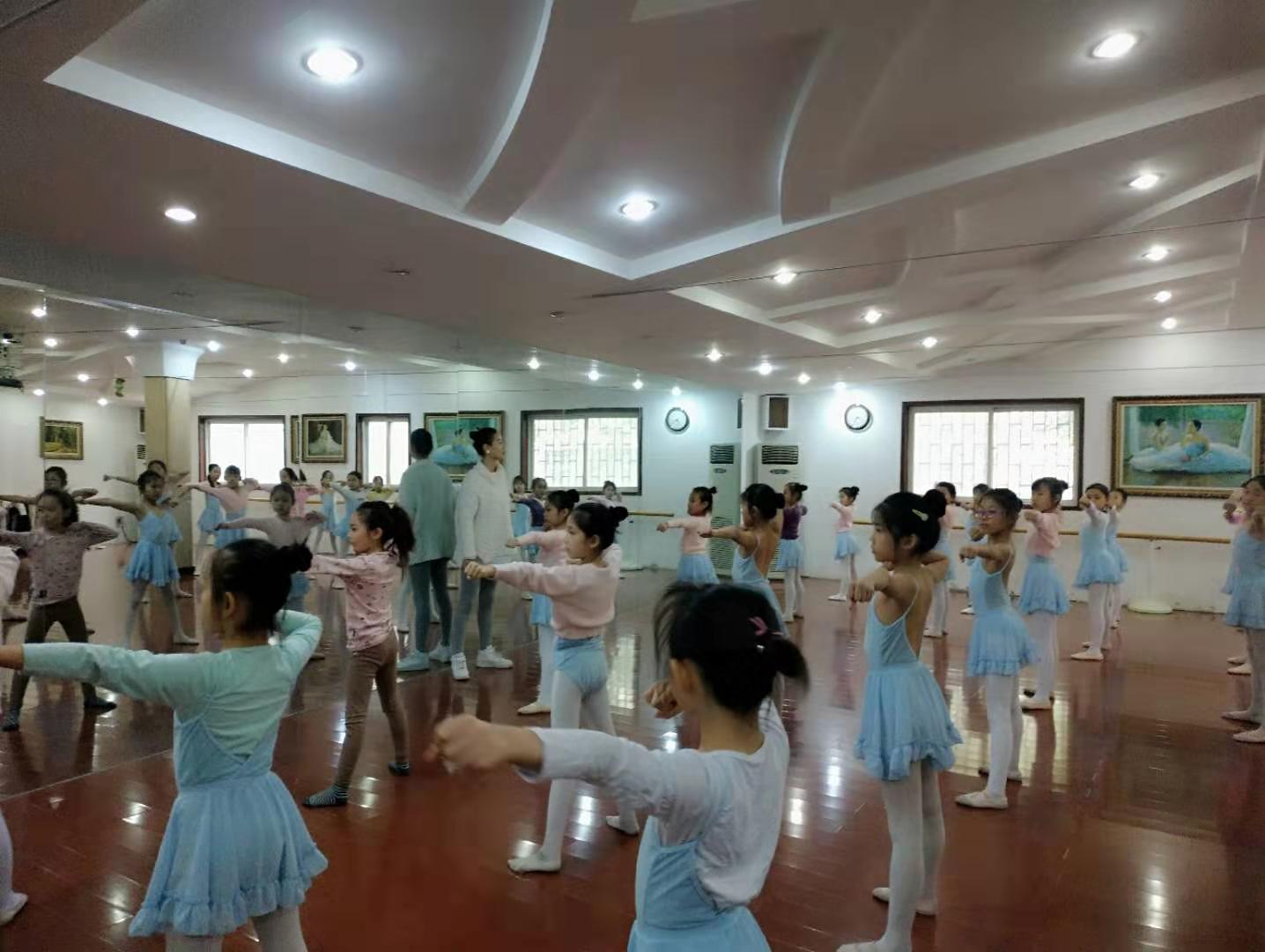 步入舞蹈教室,最引人注目的是教室正前方一面明亮的大镜子,棕褐色的木地板,十分光滑洁净。右面是一排栏杆,供舞者们练习基本功。小姑娘们统一浅粉色舞蹈服,丸子头发型,目光炯炯有神,显得格外精神。
