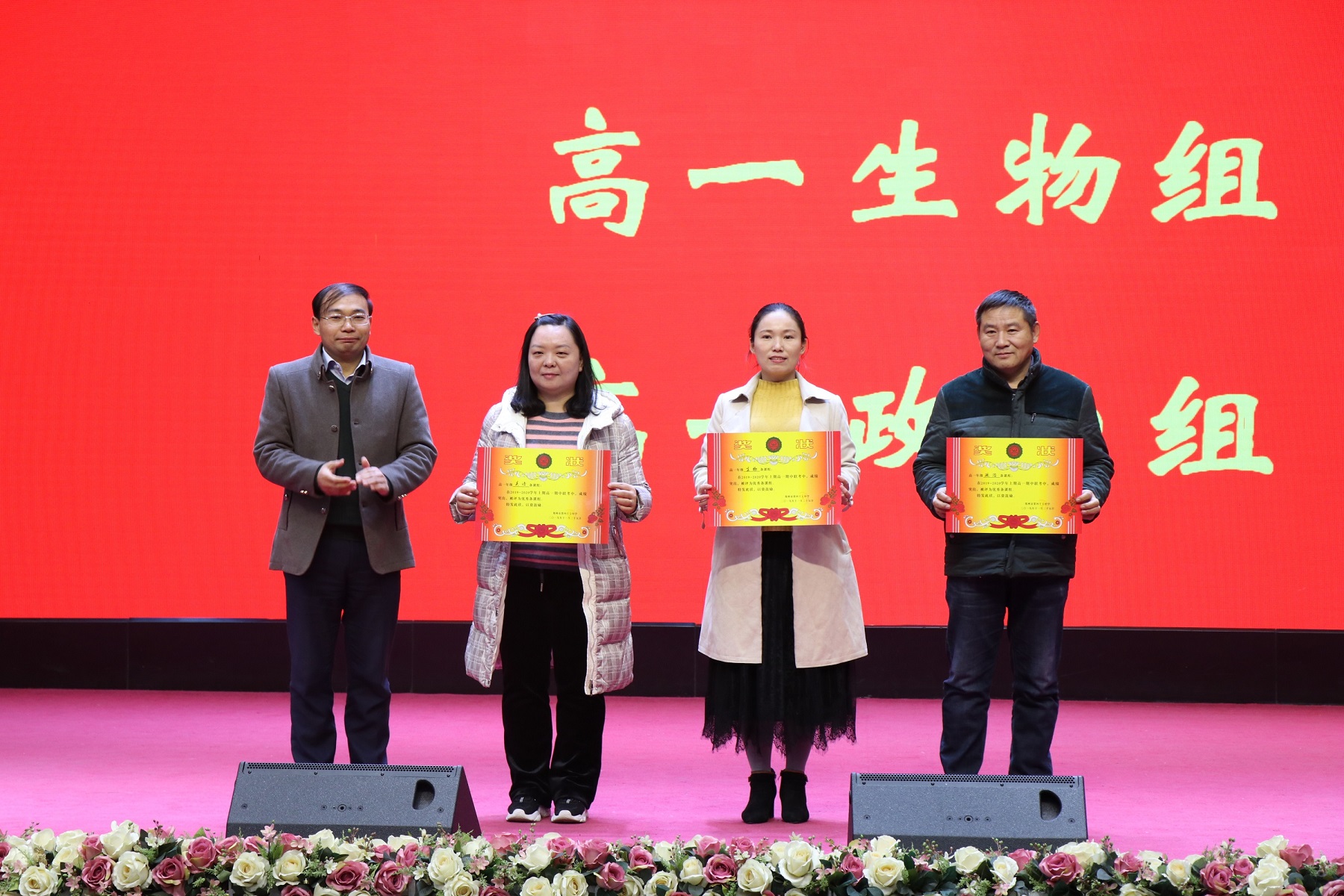 表彰会在励志视频《大雁团队》中拉开了帷幕。雁群翻山越岭,克服饥寒劳累,终达光明彼岸,凭借的是集体精神,依靠的是团结的力量。表彰会首先颁发了期中联考优胜备课组、期中联考优胜班集体和班级量化优胜班级三个奖项。雁群跋山涉水,不畏狂风暴雨,终至温暖国度,需要头雁的引领,更要头雁的示范。表彰会随后颁发了期中联考学习标兵、期中联考进步之星与动植物细胞模型制作及绘图活动优秀个人三个奖项。