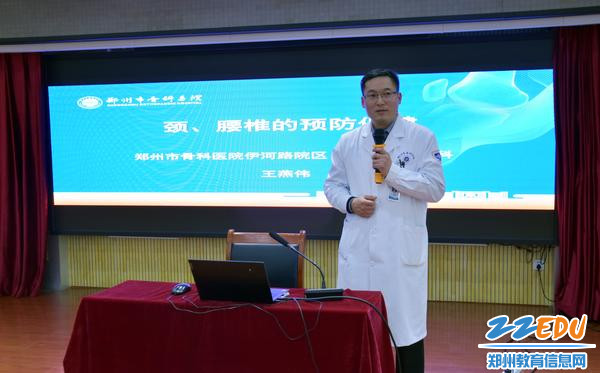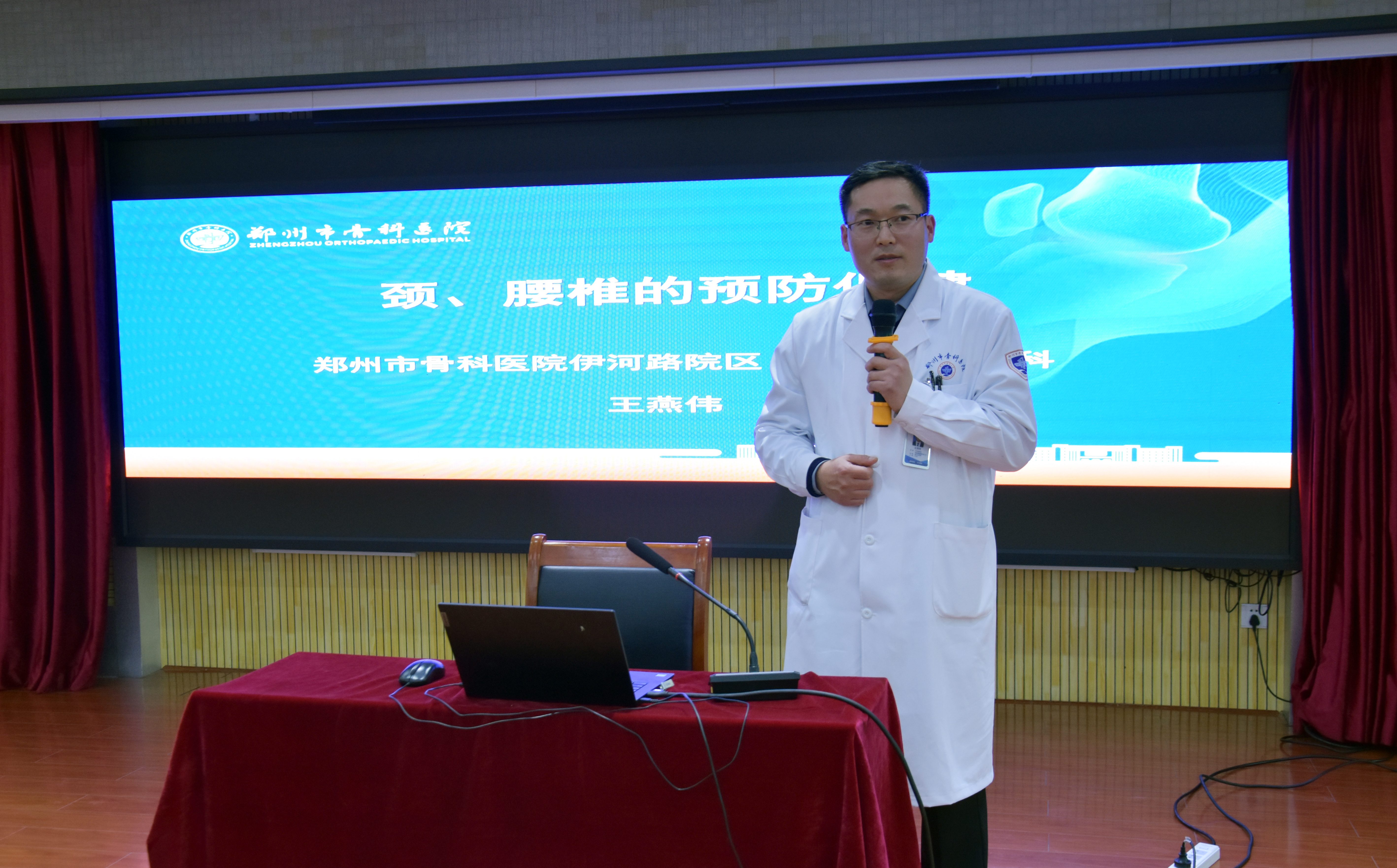 王燕伟医师是河南省骨与关节康复领域的资深专家,拥有丰富的临床经验和深厚的学术背景。在讲座中,他结合中医理论与现代医学知识,系统讲解了颈腰椎的结构功能、常见病因、临床症状及防治方法,强调了“治未病”的重要性,并分享了日常生活中如何通过调整坐姿、睡姿、合理膳食、适度运动等方式预防颈腰椎疾病。