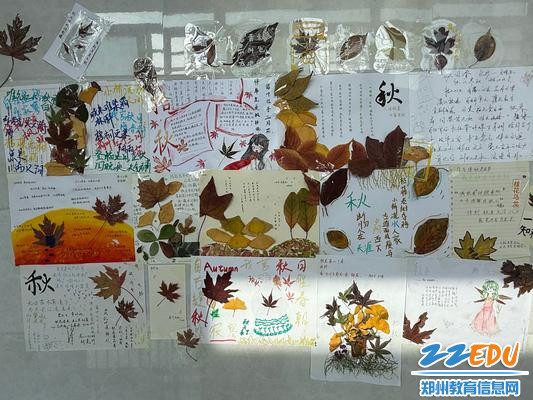 创作环节中,同学们化身“秋日创作者”,用巧思与匠心完成作品。A4手抄报“秋天的诗画卷”上,拼贴的秋叶勾勒出秋的轮廓,搭配的诗文或引“停车坐爱枫林晚”的古典雅致,或选现代诗中的秋日絮语,更有不少同学挥笔原创,将观秋的真切感受凝练成诗句,让图文在意境中深度交融。创意书签“秋叶寄情”则尽显精致灵动,压花秋叶保留着秋的脉络,微缩画作定格了秋的瞬间,背面的文字或温婉或治愈,“风把秋的信笺,折成了书签的模样”等原创语句,让小小的书签承载着满满的诗意与巧思。