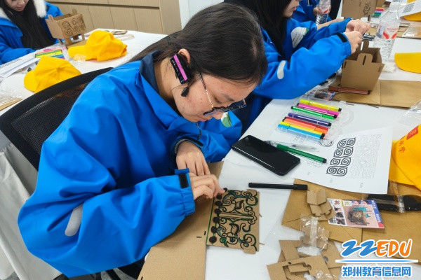 非遗体验成为当日“高光时刻”。在专业教师指导下,学生们分为两组开展工艺实践:“鼎鼎有名——画鼎”活动中,以素胚为载体,用丙烯马克笔复刻青铜鼎纹饰,体会古人审美逻辑;在“贴金”工艺体验里,手持金箔完成明信片贴金,感受传统工艺的精巧庄重。实践中,学生们交流创作思路、探讨历史寓意,实现理论与体验的深度融合。