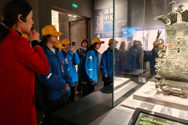 11月25日,研学师生共赴河南博物院,聚焦“青铜文明的细节解码与现代转化”。上午,学生们重点参观第三、第四展厅,围绕杜岭方鼎、妇好鸮尊等核心文物深入学习。讲解老师深入解析文物文化内涵,自由探索时,学生们细致观察纹饰细节,为设计储备“视觉素材”。