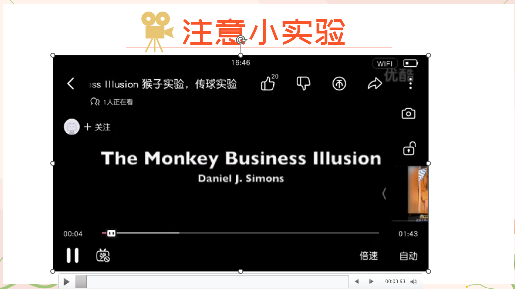 接下来,师生一起观看视频《消失的大猩猩》,走进注意力小实验:当时参加实验的人要求看着这一视频数出白色T恤衫的女生接了多少次球。在视频中间发生了很多奇怪的事情:一名装扮成大猩猩的学生走到运动场中间,猛拍自己的胸脯,然后溜之大吉,而且窗帘的颜色也有变化。在视频播放结束后,参加实验的人被问到是否注意到了不寻常的事情,也就是是否看到了大猩猩,有一半的人惊讶地摇头,大猩猩?什么大猩猩?这——“看不见的大猩猩”实验是心理学上最著名的实验之一,验证了所谓的“注意力错觉”:我们认为没有错过任何在视野范围之内发生的事情,但实际上我们只看到了自身所关注的部分——在这个实验里是接球次数,而我们没有关注的内容可能就像大猩猩那样外形庞大而且显眼,但它却在我们眼皮底下溜走了。身临其境的实验使同学们感受到注意具有选择性、注意资源的有限性。