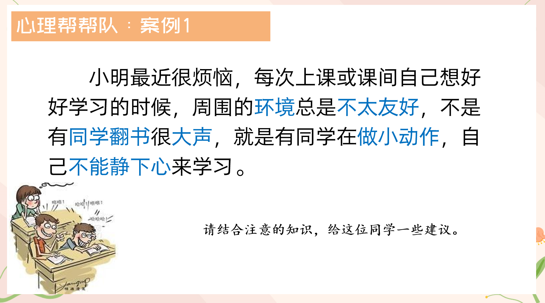 注意的三个特征,你get到了吗?同学们带着三个智慧锦囊,成立心理帮帮队,运用注意的相关知识在线帮助求助人员解决困难。帮助别人就是帮助自己,在实践中,大家清醒地认识到:注意可以控制,主动把注意放到需要的地方;没有人是舞台中心,时刻被人注意;每个人都会从自己的角度看到世界,正确对待别人的意见和看法,不要太过于在意评价等等。