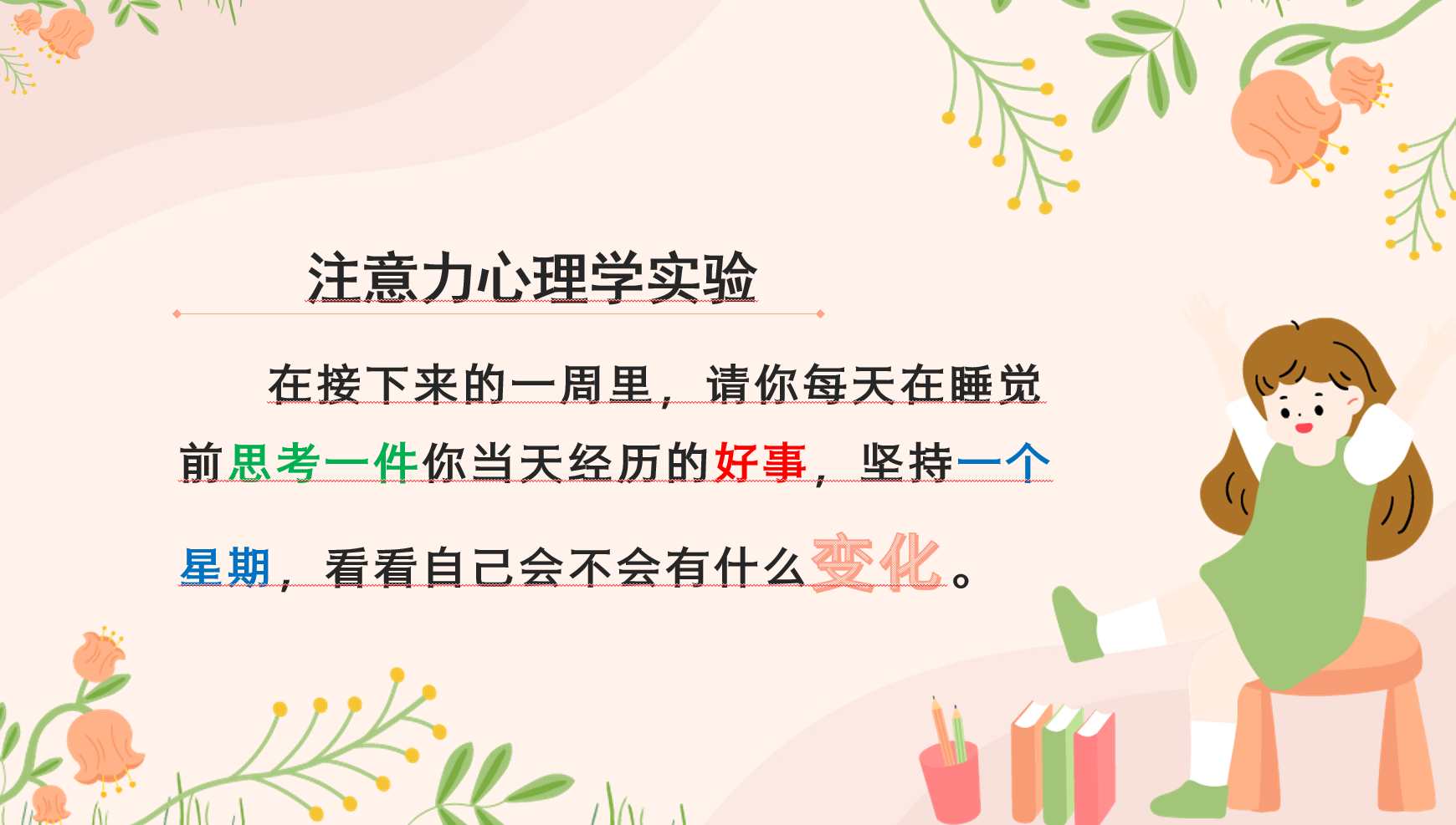 积极思考造成积极人生,消极思考造成消极人生。活动最后,薛老师邀请大家积极参与注意力心理学实验:在接下来的一周里,请同学们每天在睡觉前思考一件当天经历的好事,坚持一周,看看自己会不会有什么变化。希望同学们通过本次团体心理辅导,能够学会增加注意积极的内容范围,拥有积极的心态,迎接挑战,收获成长!
