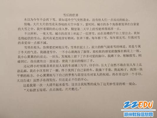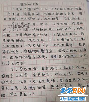 大自然是孩子教育之神,孩子可以在一草一木、一雨一露、一花一土中孕育出高超的智慧、坚毅的心胸以及敏锐的感受力。面对大自然的馈赠,郑州八中语文老师启发学生发现感受雪后郑州的别样魅力。孩子们赏景、玩雪,在真切的体验下用文字书写这次美妙的作业。