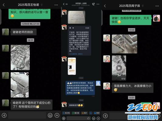 雪花不仅培养了学生身上的文人浪漫,也蕴含着无限的奥秘。物理老师鼓励孩子们到户外学习物理知识,感受雪后噪声的变化、光强度的变化,观察冰挂并思考其形成过程,感受雪面和冰面上摩擦力的变化,学生带着好奇心去探究雪后的神秘,师生之间进行了头脑风暴的交流。