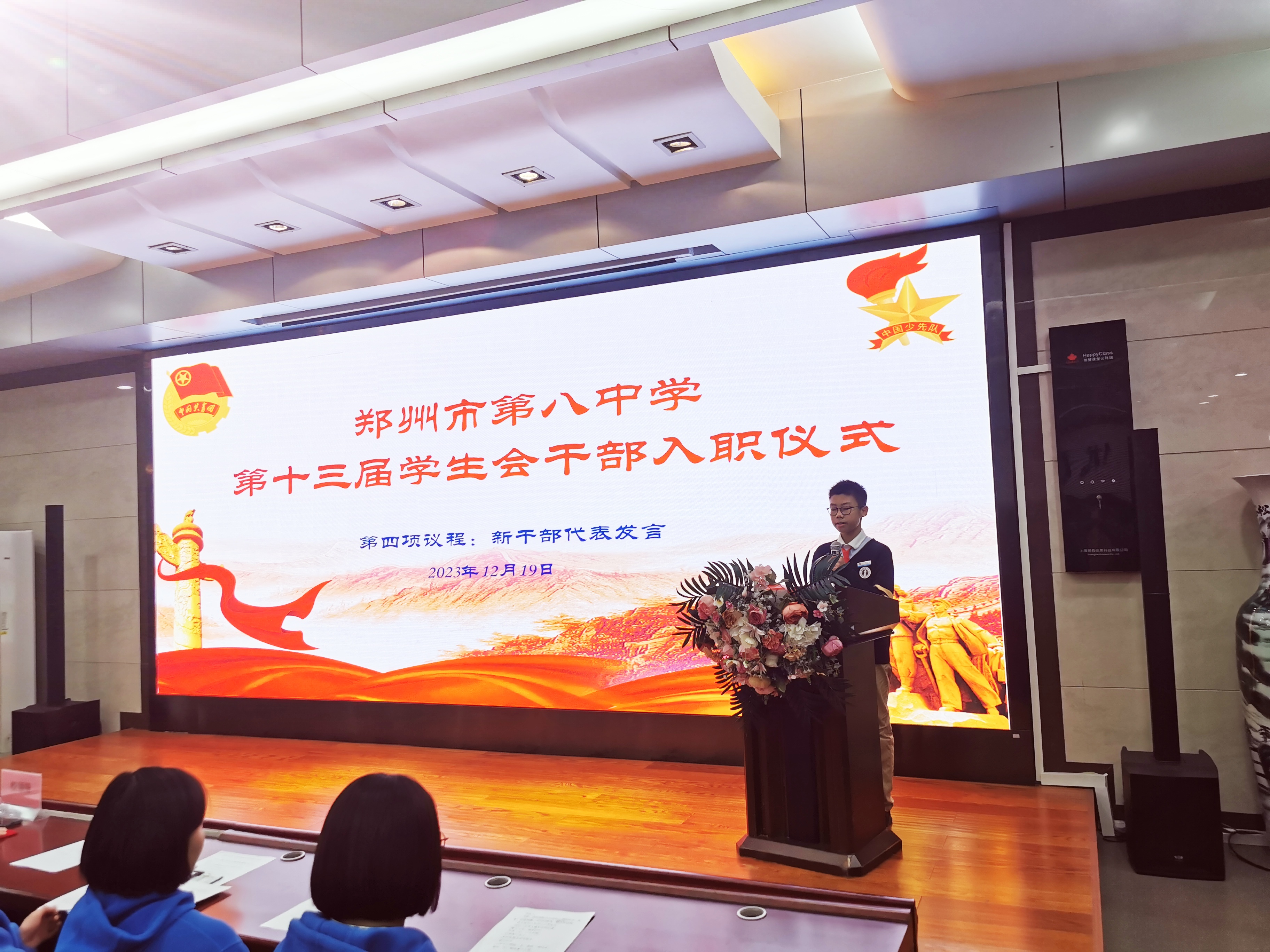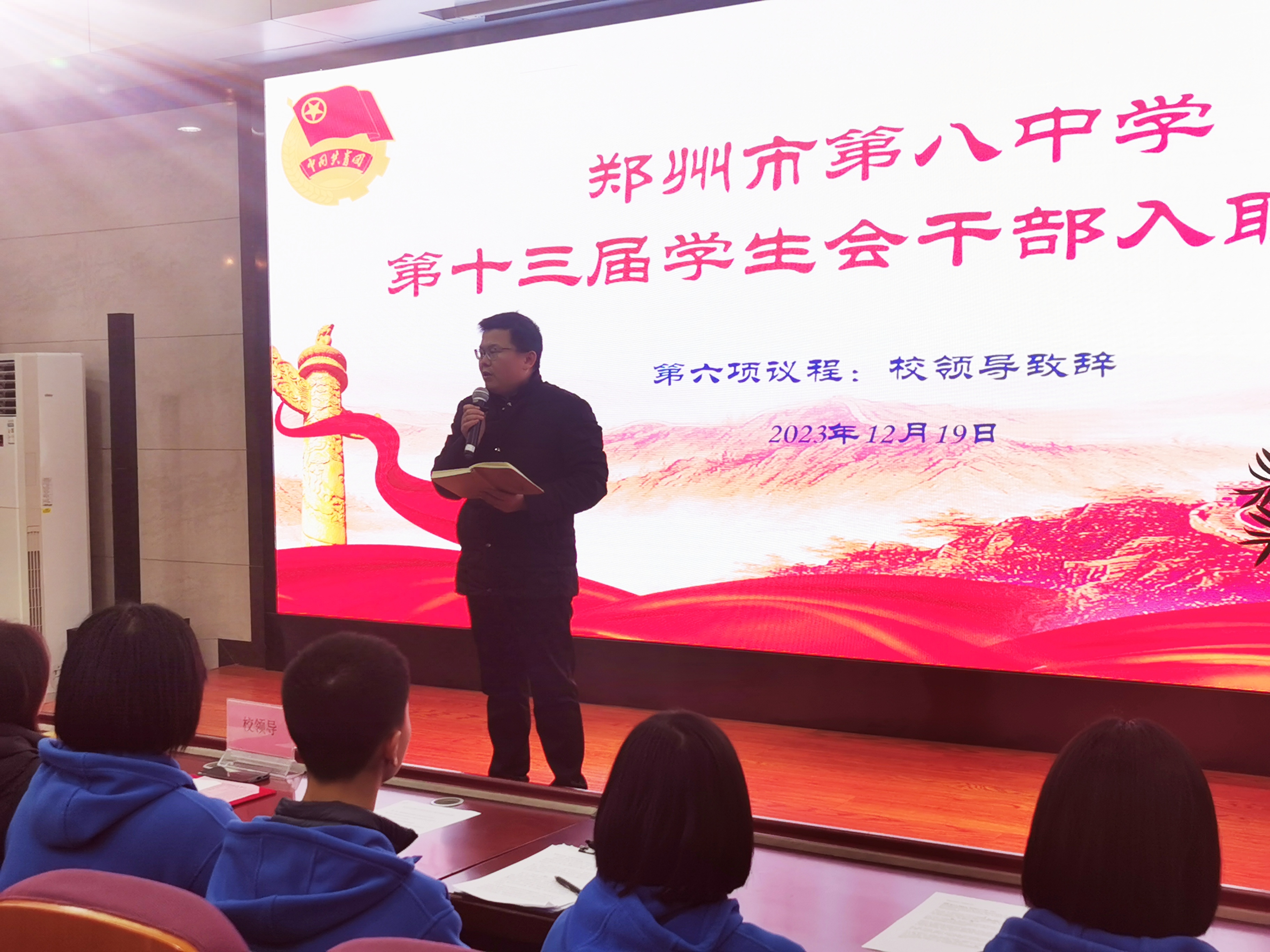 学生会干部一直以来都是学校联系学生的桥梁和纽带,是学校管理的助手和生力军。为进一步加强学生干部队伍建设,更好地服务全校广大师生,促进学生自身发展。12月19日下午,郑州八中在多功能报告厅举行团委委员暨第十三届学生会成立大会。郑州八中副校长雷炀、政教处副主任甘铁权,学生会负责老师,各班班长、团支书、大队委、学生会干部参加仪式。