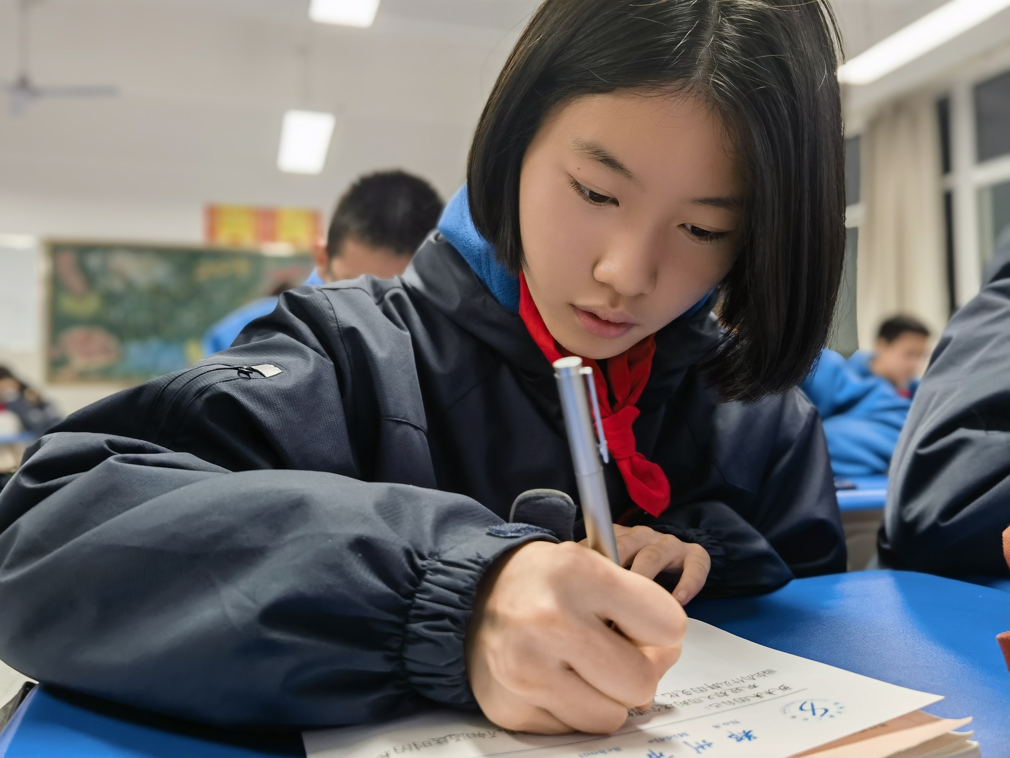 活动最后,伴随着舒缓的音乐,同学们尝试着将自己沉淀下来,回想从前、把握现在、展望未来,拿起笔,书写一封信,给未来的自己。有的坐在桌前奋笔疾书,脸上洋溢着幸福的笑意;有的边望向远方边冥思苦想,似乎有所期待又徘徊不定。