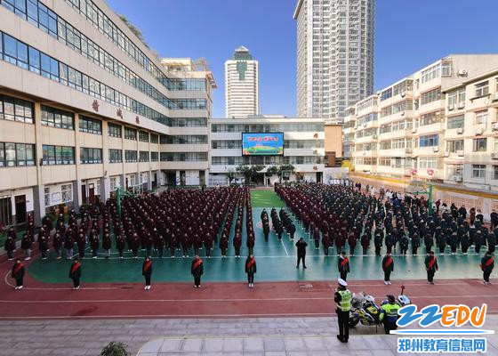 上午,郑州七初东校区举行交通安全日主题升旗仪式,随着激昂的国歌奏响,五星红旗冉冉升起,全体师生庄严肃立,行注目礼,唱响国歌。
