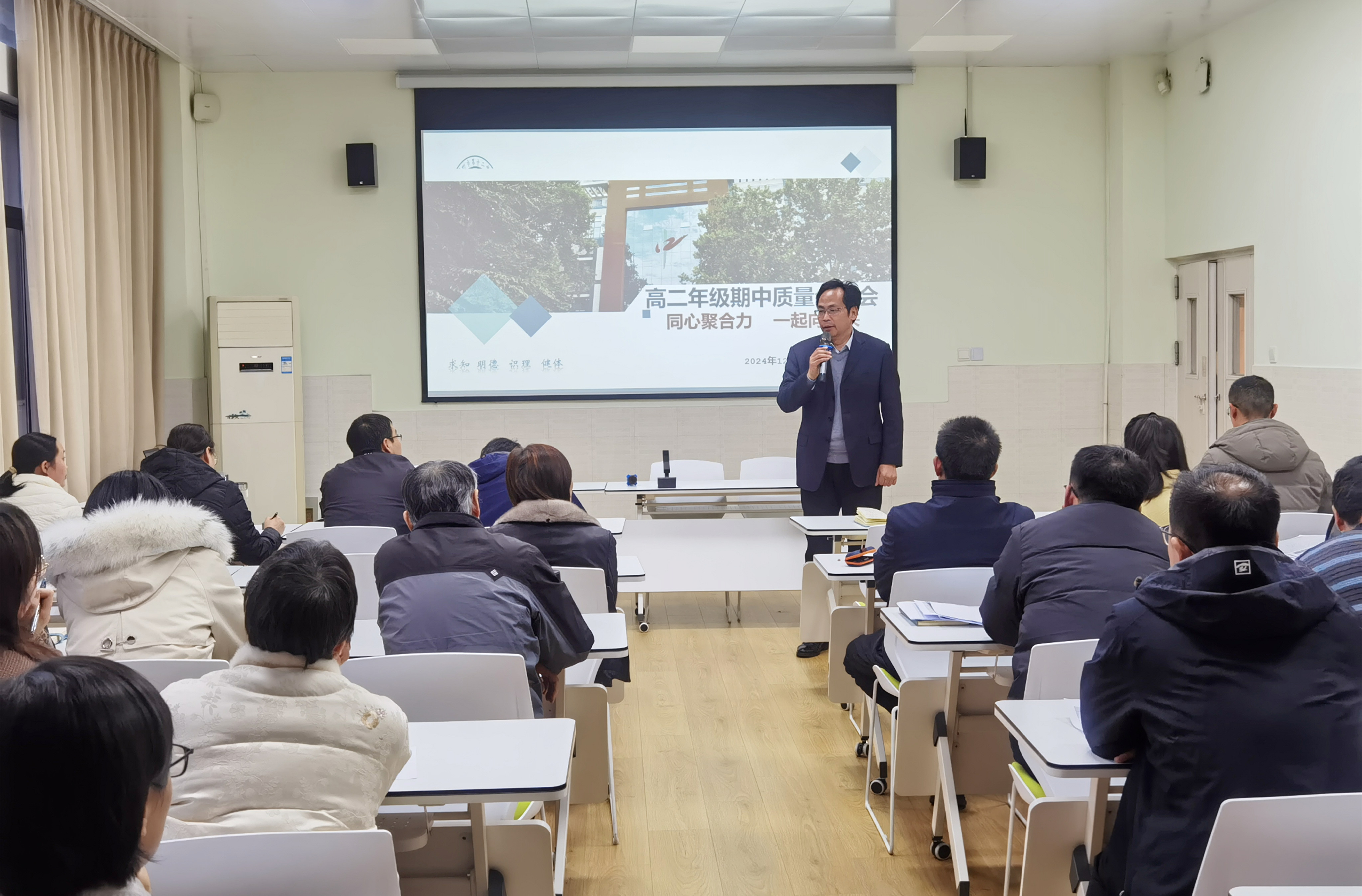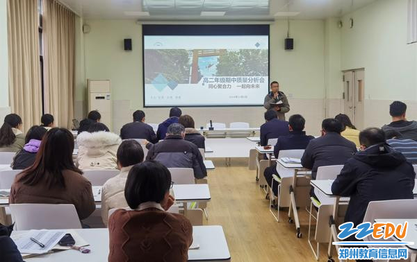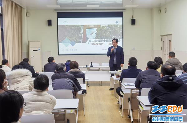 以考为镜,知新求进。为了全面分析高二上学期期中考试成绩,进一步提高教学质量,强化教学管理,调整教学策略,明确下一阶段的努力方向,2024年12月2日下午,郑州市第十二中学高二年级召开期中质量分析会。会议由教务副主任郭志强主持,校长周铭、副校长史克威及全体高二年级老师参加此次会议。