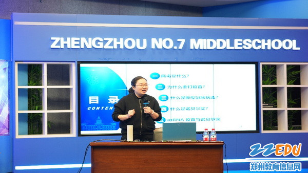 为了培育创新文化,弘扬科学家精神,厚植创新土壤,也为了让更多的高中生了解科学、提升科学素养、激发对科学的热爱和好奇心,2024年12月3日下午,郑州市第七高级中学特邀河南农业大学二级教授、博士生导师褚贝贝到学校开展以《病毒和疫苗》为主题的科普讲座。这是郑州市第七高级中学第233期博雅讲堂,也是共青团河南省委“科技之光青年讲堂--青年科学家进校园”活动2024年度第16场讲座。