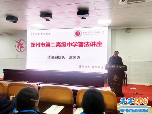 郑州市第二高级中学法治副校长焦国强对学生进行普法教育