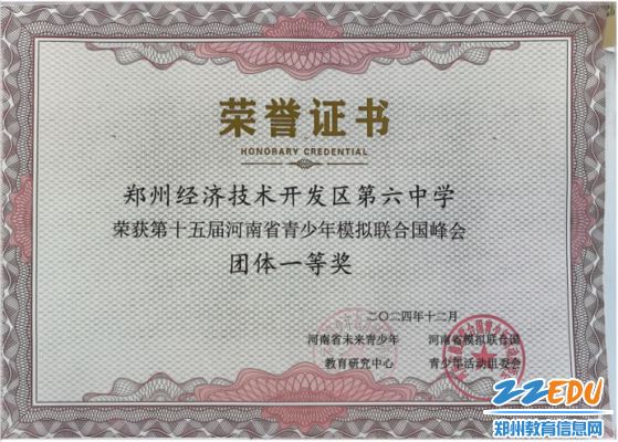 近日,河南省第十五届青少年模拟联合国峰会在郑举行,来自全省46所中小学校的960余名师生代表,在联合国议事规则指导下,就战争冲突对人类生活环境的影响、人工智能时代下城市交通管理及基础设施发展等22个国际热点议题相互交流磋商。继2023年荣获河南省第十四届青少年模拟联合国峰会团体一等奖后,郑州经济技术开发区第六中学再次斩获第十四届青少年模拟联合国峰会团体一等奖。