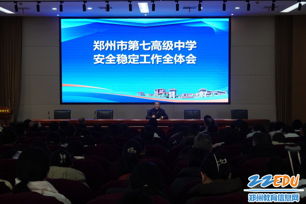 2024年12月24日上午10点,郑州市第七高级中学在学校学术报告厅召开安全稳定工作全体会,全体教职工参加,会上,郑州市第七高级中学党委书记王保军传达了全市教育系统安全稳定工作会议精神,部署学校安全工作。
