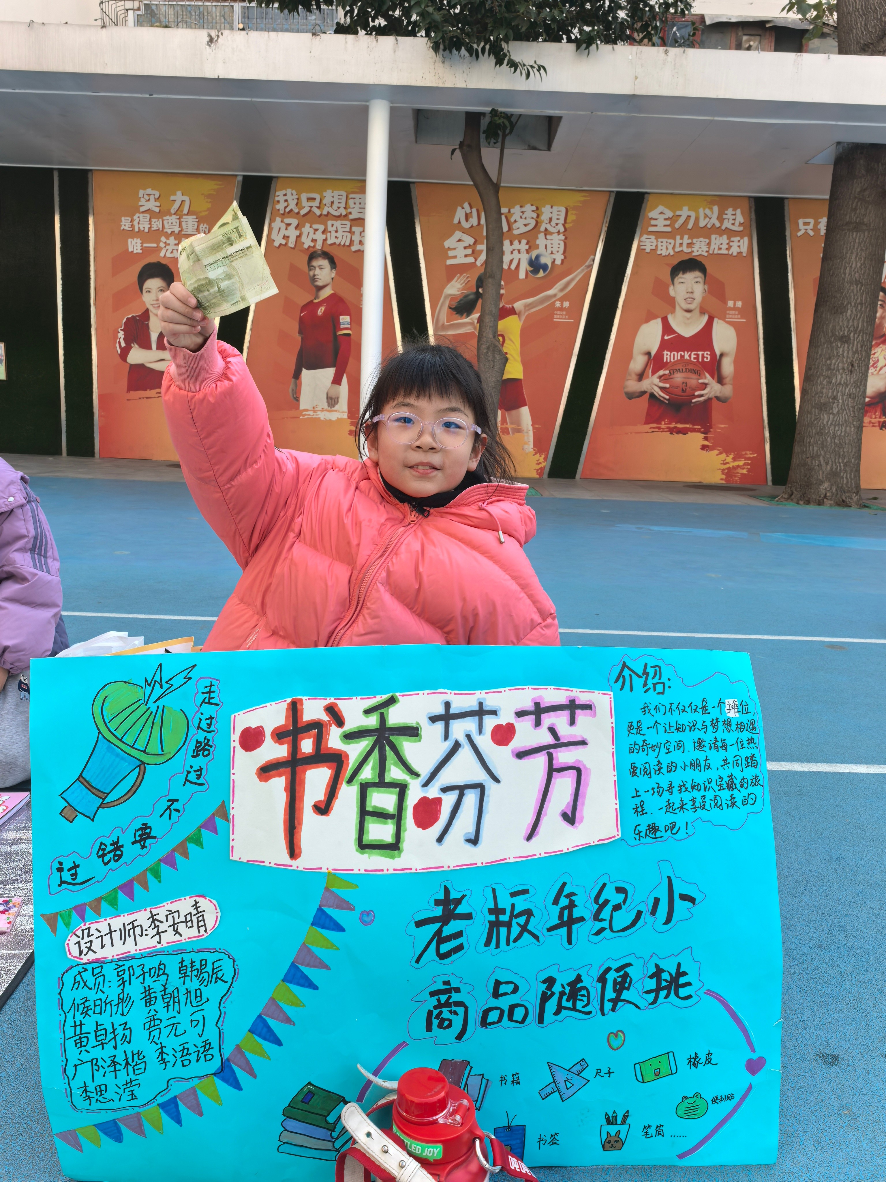 “快来看看我的书摊!”“老板年纪小,商品随便挑。”……在活动现场,学生们热情高涨,纷纷展示自己带来的图书、书签、书架、笔筒等物品。每个小组精心布置了自己的摊位,通过创意海报和标签吸引顾客。