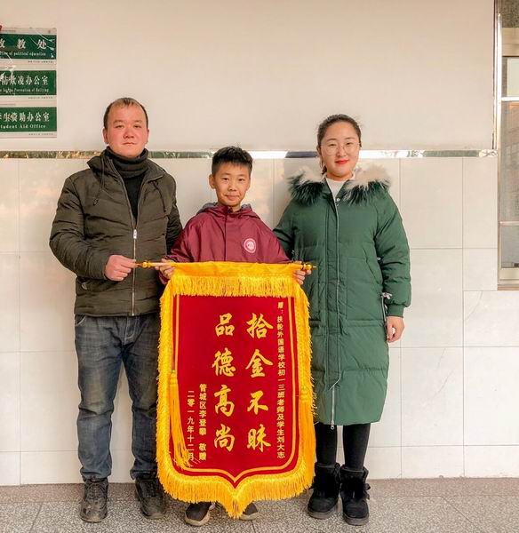 2019年12月2日早上,郑州市扶轮外国语学校初中部七年级三班的刘大志同学在学校门口捡到钱包一个,里面有身份证2张,银行卡四张,现金400元,刘大志同学立即主动交给班主任杨会敏老师,送至政教处,学校及时联系派出所,在民警的帮助下,最短时间内找到失主李先生。李先生得知刘大志同学拾金不昧精神可嘉尤为感动,于12月5日下午特意前往学校送来锦旗,表达对学校及该同学的谢意,衷心感谢学校教出这样的好学生。郑州市扶轮外国语学校为表扬这种拾金不昧精神,决定授予刘大志同学“郑州市扶轮外国语新时代好少年”荣誉称号。