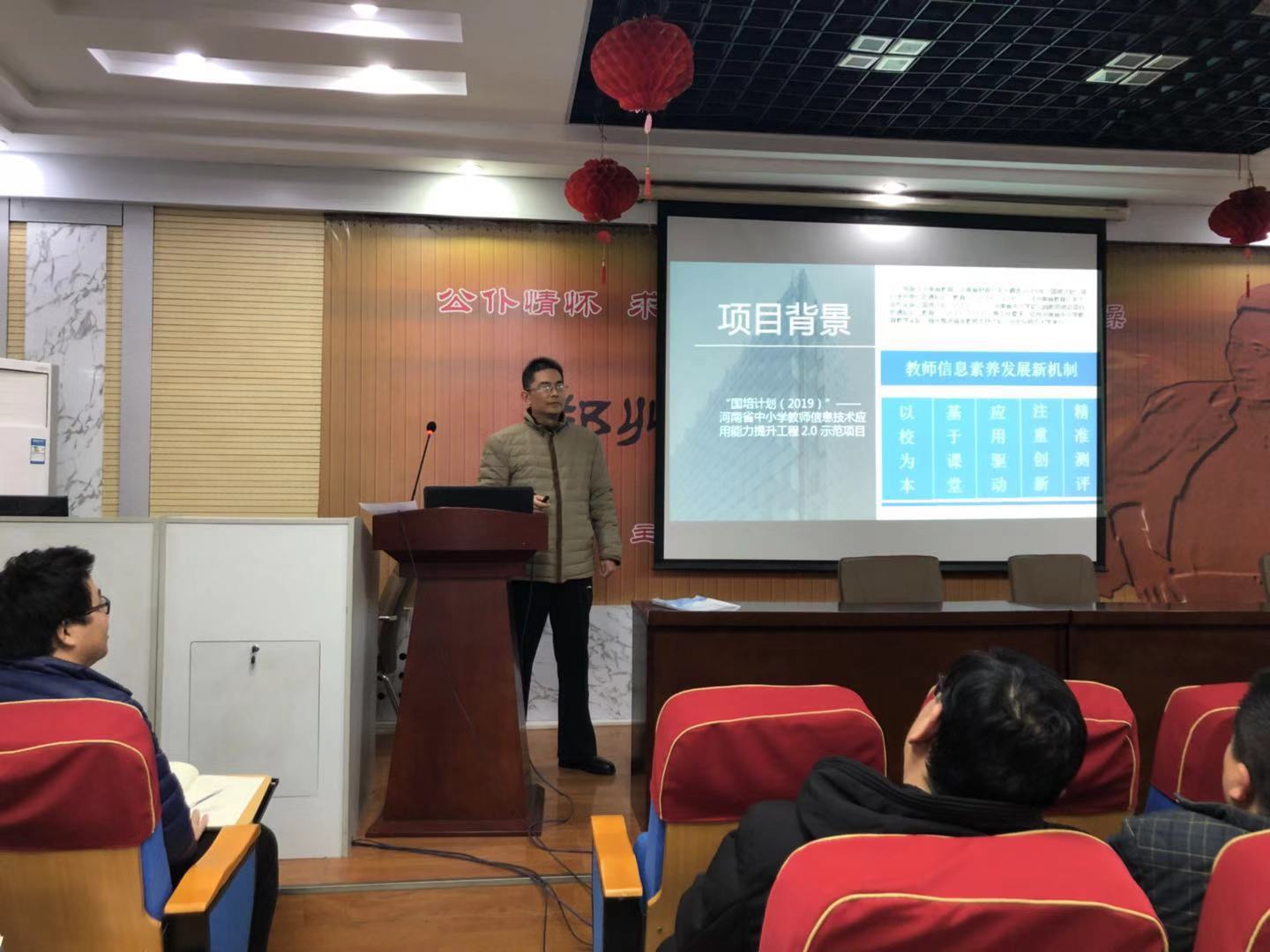信息中心主任杨照华作为主讲人,利用主题鲜明、层次清晰的课件,通过项目实施角色、平台提供、培训模式、培训内容、阶段任务、培训考核、应用考核七个方面展开,把“学员选点、课程学习、校本活动”作为培训重点,强调了“三种环境、四个维度、30个能力点”。杨照华的讲解深入浅出,老师们认真听讲,对此次培训有了更清晰的认识。