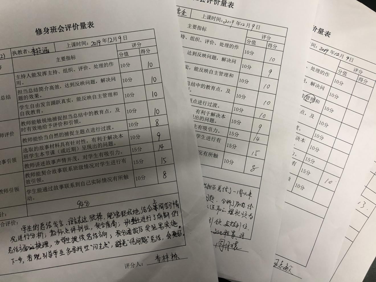 修身班会课上,学生主持个个自信大方,点评得当,同学们积极表述自己的担当任务和担当效果,结合班级同学在校园生活表现,相互提出了诚恳的建议,部分同学也对自己的行为进行自评,同学们一个个认真思考,发表想法,提供解决问题的途径。班会课气氛活跃,课堂环节安排紧凑,形虽似但神各异,展现不同的特点和亮点,在引领环节中班主任老师肯定了同学们的进步,也指出了同学们在学习和生活中还存在的一些问题。各位班主任老师用心聆听,认真记录课堂中的每一环节并进行打分、评定。