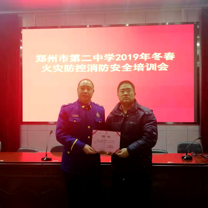 随后,郑州二中副校长狄雷刚宣布郑州二中成立“校内消防队”的决定。工会主席陈胜为杨志勇发放“郑州市第二中学校园消防安全指导员”聘书。会后,杨志勇对郑州二中“校内消防队”成员和部分教师进行了消防器材培训,并检查学校消防设施。