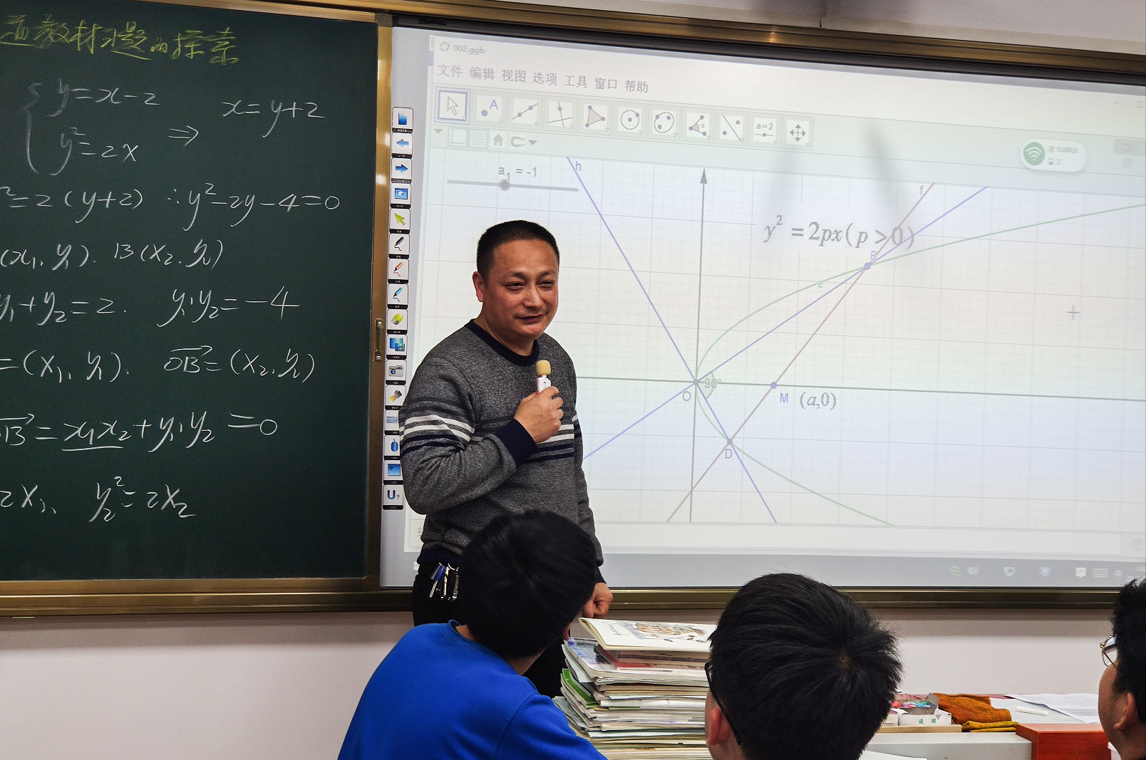 同样精彩的还有焦建恩老师的数学课。这节课的主题是《对一道教材习题的探索》,课堂上,焦老师从课本上的一道关于抛物线的题目讲起,借助几何画板,带领学生展开发散性思维,通过调整、变更题目中的条件和数据,观察方程与图像之间的联系。在焦老师的引导下,内容得到了极大地丰富,学生的思维品质得到了提升,对知识的理解更深入、更透彻。