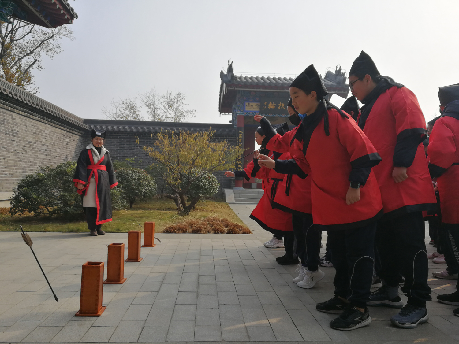 学生们在体验由“射”艺演化而来的”投壶”游戏