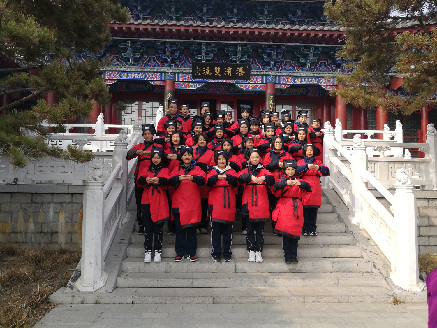 郑州八中举行“感受园林艺术 传承华夏文明”主题团日活动,学生干部在园博园门口合影。
