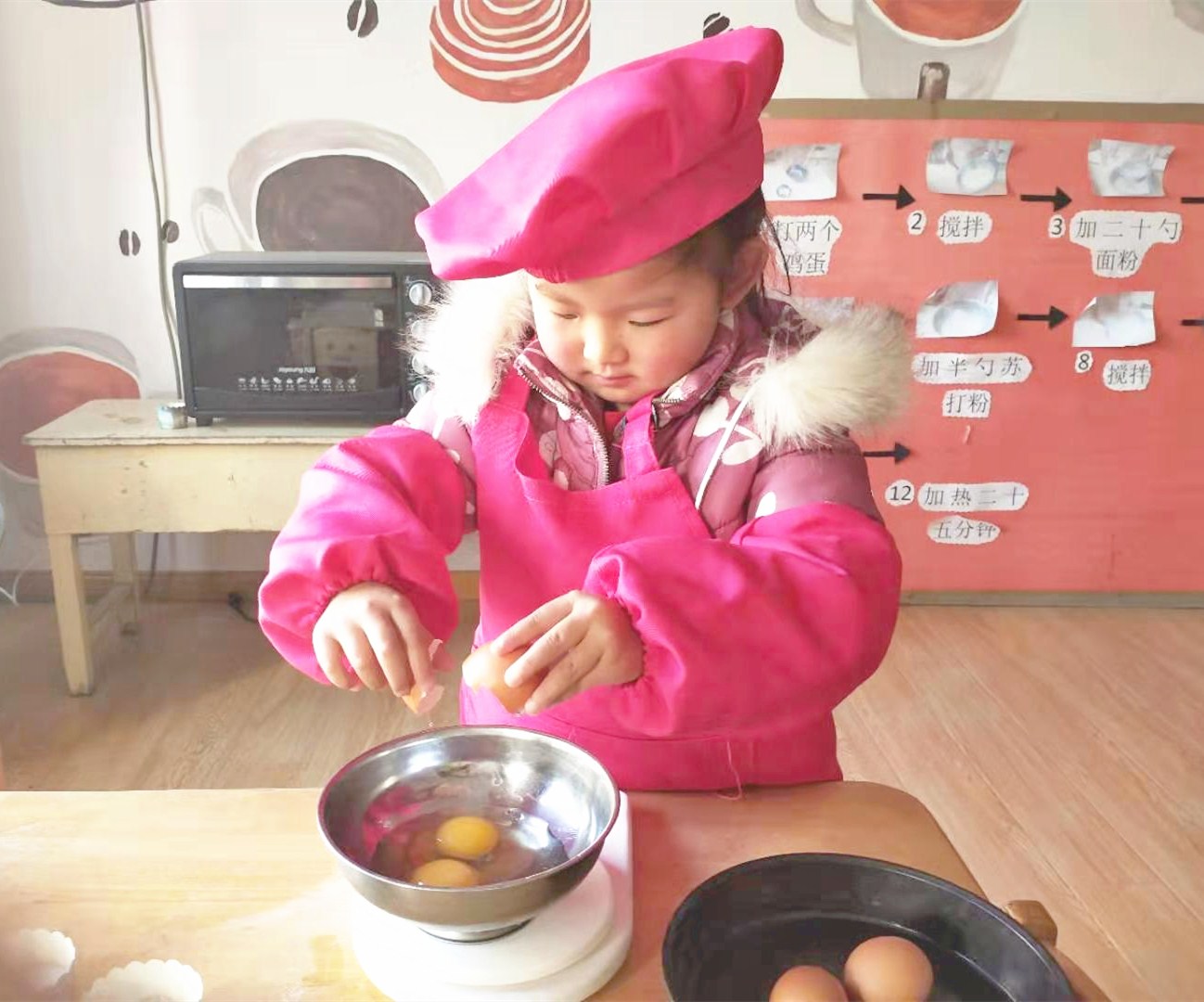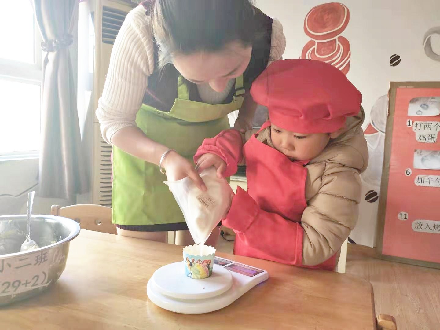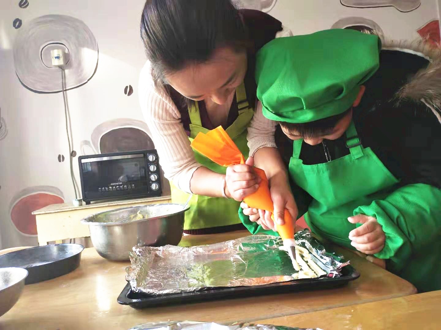 烘焙课开始啦~烘焙室有专门给小盆友们准备的操作服,各种各样的模具,孩子们看到了这么多新奇的工具,一个个跃跃欲试!平日鸡蛋都不会打的孩子们,在老师的指导下,自己动手制作起了饼干。随着手工饼干在烤箱中不断地变得金黄,一阵阵香味让大家垂涎欲滴,很多宝贝还表示回到家里还要教爸爸妈妈一起制作饼干呢