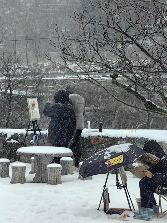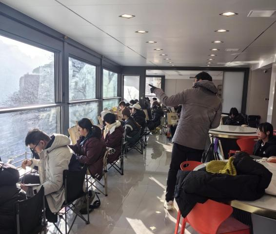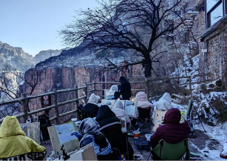 12日,太行山脉迎来大雪,位于绝壁之上的郭亮村银装素裹,红岩绝壁与皑皑白雪相映成趣,宛如一幅雄浑壮阔的水墨丹青。抵达目的地后,美术教师首先讲解雪景写生的构图技巧,引导学生捕捉雪中光影的微妙变化,感受自然与人文交融的独特美感。