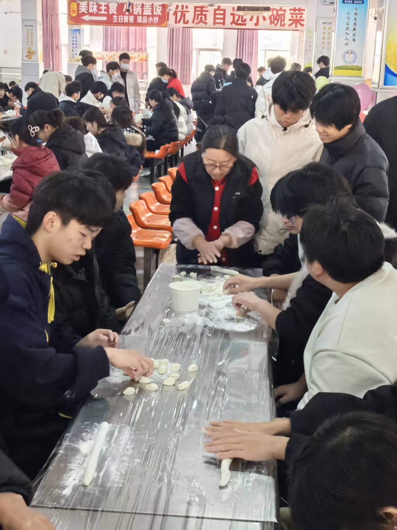 活动伊始,学校党委书记魏勇首先向全体留宿同学致以节日的问候。他表示,学校始终是同学们的第二个家,希望通过这类富有中国传统文化内涵的集体活动,让大家在感受节日温暖的同时,也能体会到劳动与合作的快乐。随后,食堂面点师傅和生活老师作为“技术指导”,登台为同学们讲解了冬至“吃饺子”习俗的由来,并现场逐步演示了和面、擀皮、包馅的技巧与卫生安全须知。同学们凝神观看,跃跃欲试。