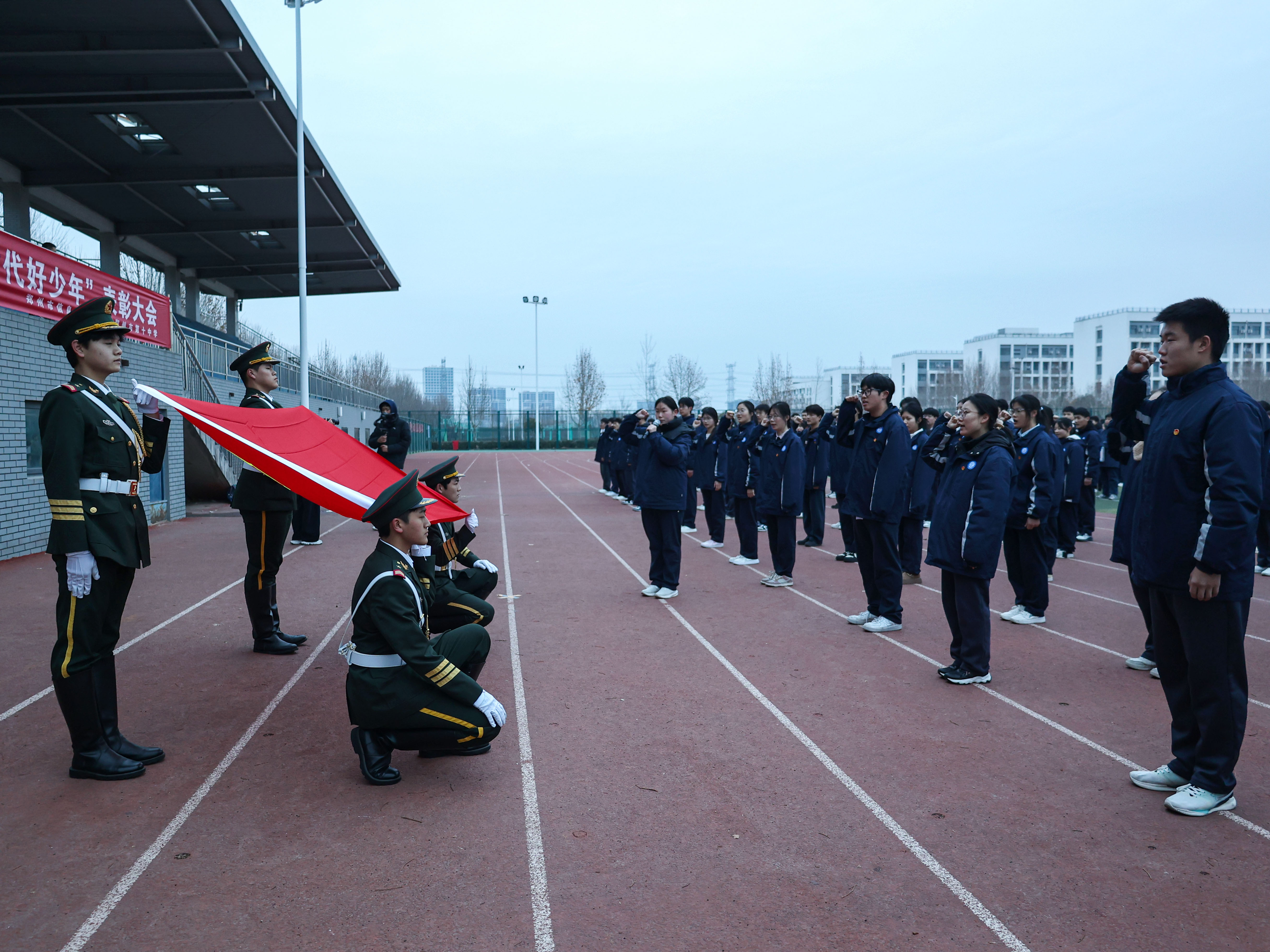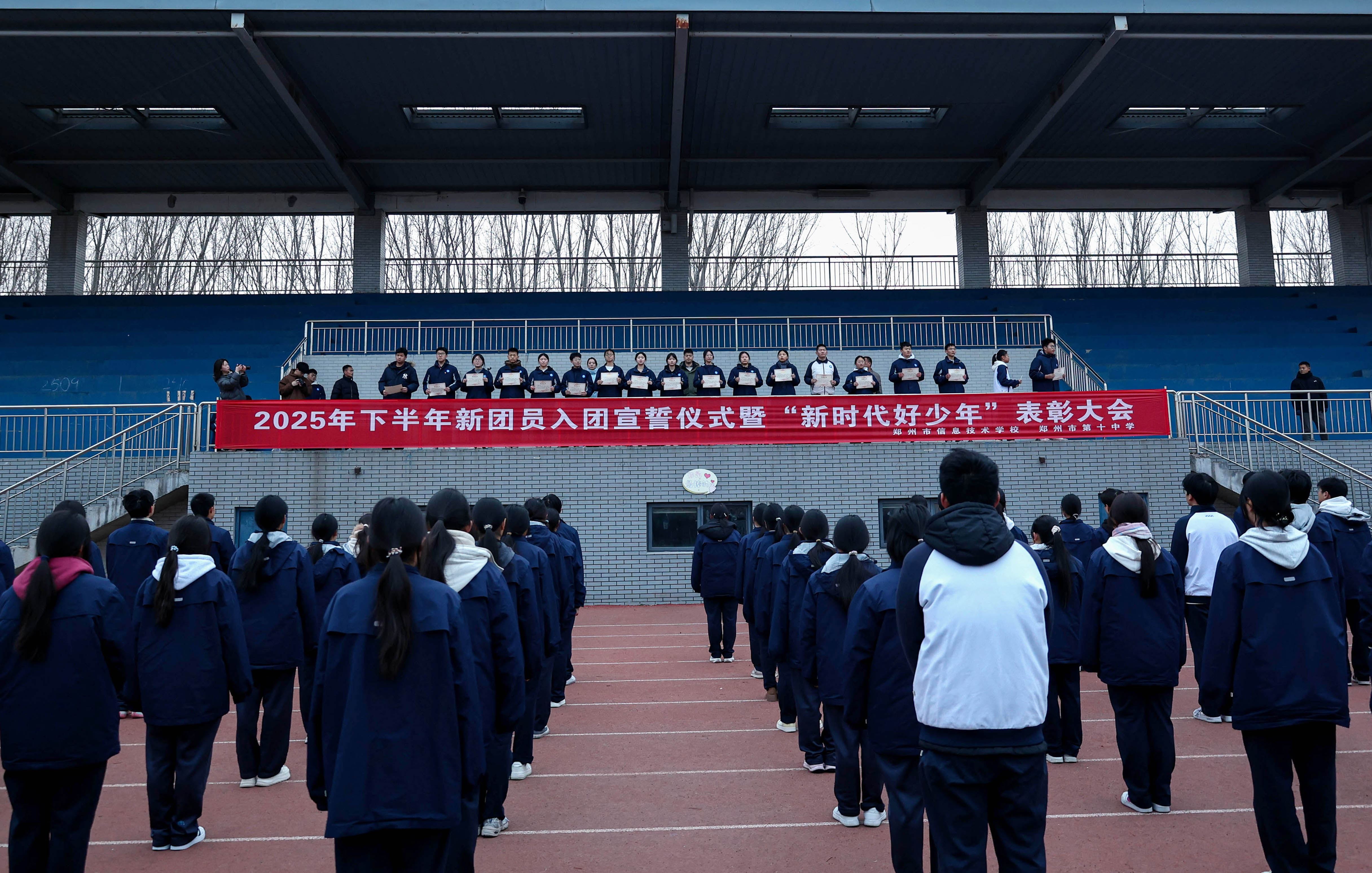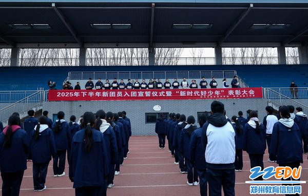2025年12月22日清晨,郑州市信息技术学校(郑州市第十中学)举行2025年下半年新团员入团宣誓仪式暨“新时代好少年”表彰大会。学校副校长朱荣涛、团委书记李晓培、政教处主任张坤及全体师生共同见证这一庄严时刻。