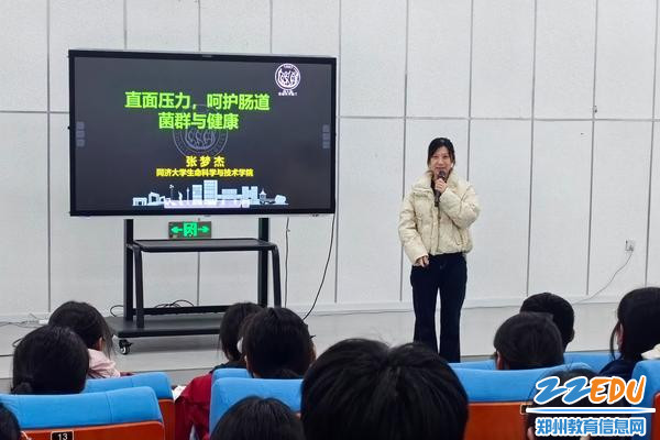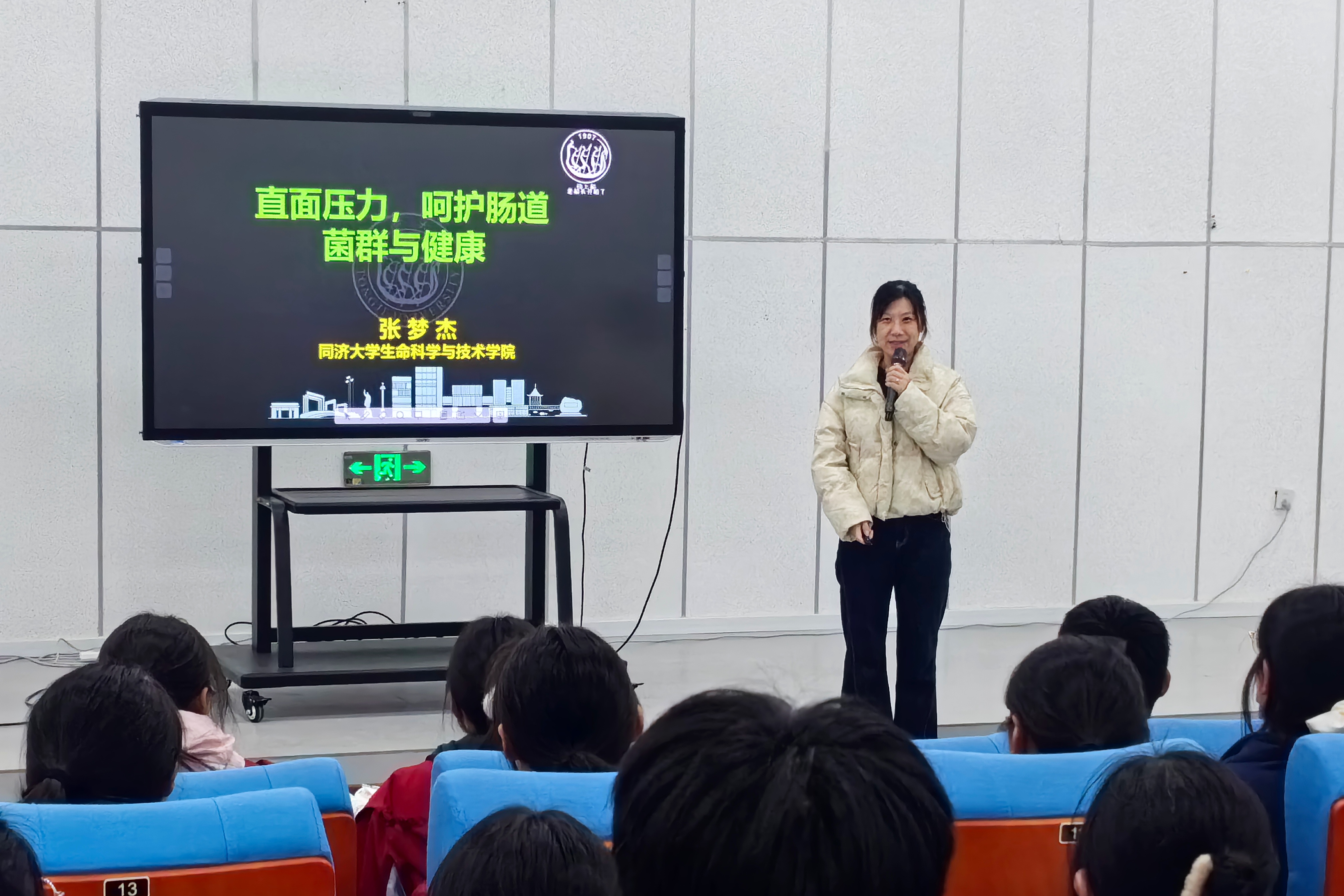 在专业分享环节,张梦杰以《直面压力,呵护肠道菌群与健康》为题,结合高中生学习生活实际,带来了通俗易懂的生命科学知识普及。她从高中生常见的学业压力、生活压力来源切入,运用生动风趣的语言、鲜活具象的案例,清晰阐释了肠道菌群的构成、核心功能,以及压力对肠道菌群平衡的深层影响,并针对性地给出了科学饮食、规律作息、适度运动等呵护肠道健康的实用建议。整场讲解深入浅出、娓娓道来,将原本晦涩的生物学知识转化为易于理解的生活常识,有效激发了同学们对生命科学领域的探索热情。