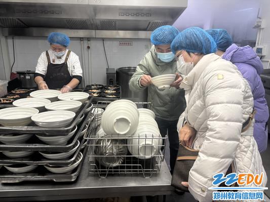 膳食委员会成员进入后厨检查餐具清洗消毒情况