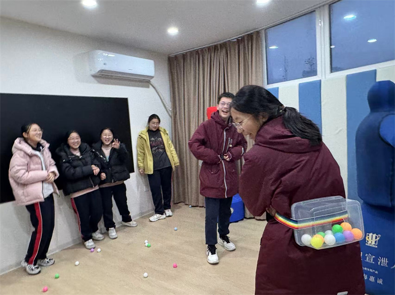 艺术表达沉淀心绪后,活动迎来动态释放环节。社员们走进情绪宣泄室,参与“公鸡下蛋抖球挑战”。大家将象征压力与烦恼的乒乓球装入特制背盒,随着音乐尽情舞动,在安全专业的空间中将“负能量”一一抖落。现场气氛热烈,加油声与笑声此起彼伏,身心在律动中获得释放与轻松。
